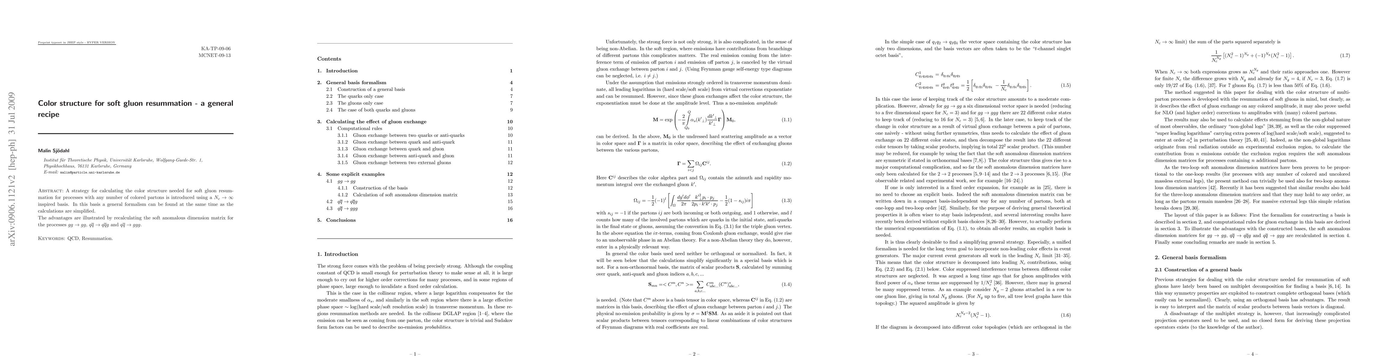 A strategy for calculating the color structure needed for soft gluon resummation for processes with any number of colored partons is introduced using a N_c --> infinity inspired basis. In this basis a general formalism can be found at the same time as the calculations are simplified. The advantages are illustrated by recalculating the soft anomalous dimension matrix for the processes gg --> gg, q\qbar --> q \qbar g and q\qbar --> ggg.