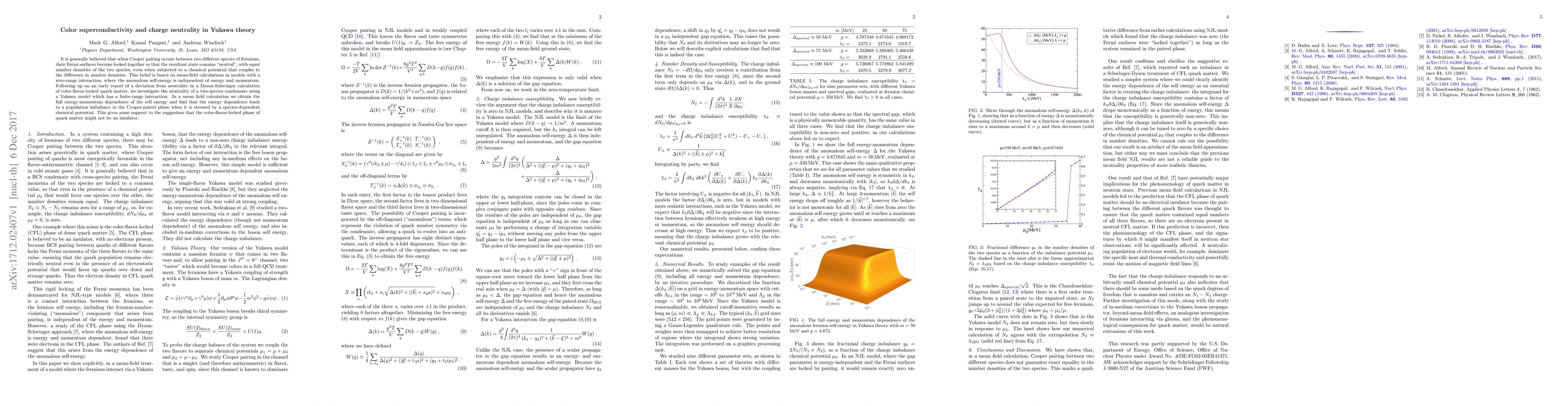 This paper investigates the neutrality of a two-species condensate in a Yukawa model with finite-range interactions, finding that energy dependence of the self-energy can lead to a population imbalance under chemical potential stress, challenging the conventional belief of neutrality in Cooper pairing. This suggests that the color-flavor-locked phase of quark matter may not behave as an insulator.