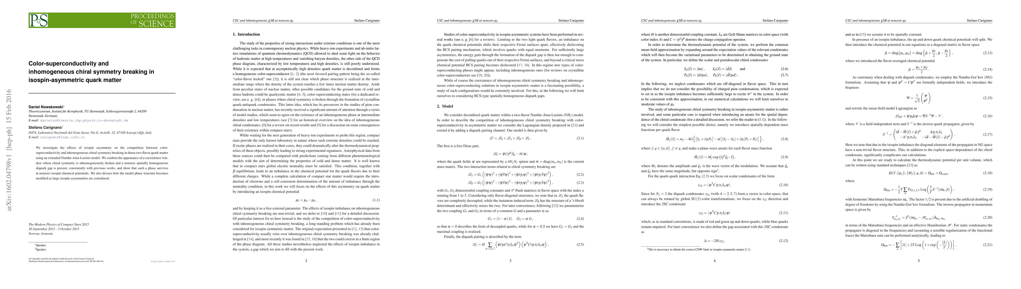 This paper explores how isospin asymmetry influences the interplay between color-superconductivity and inhomogeneous chiral symmetry breaking in dense two-flavor quark matter, confirming a coexistence window where both phenomena occur, and demonstrating that this phase persists under nonzero isospin chemical potentials. The study also examines modifications in the phase structure with increasing isospin asymmetry.