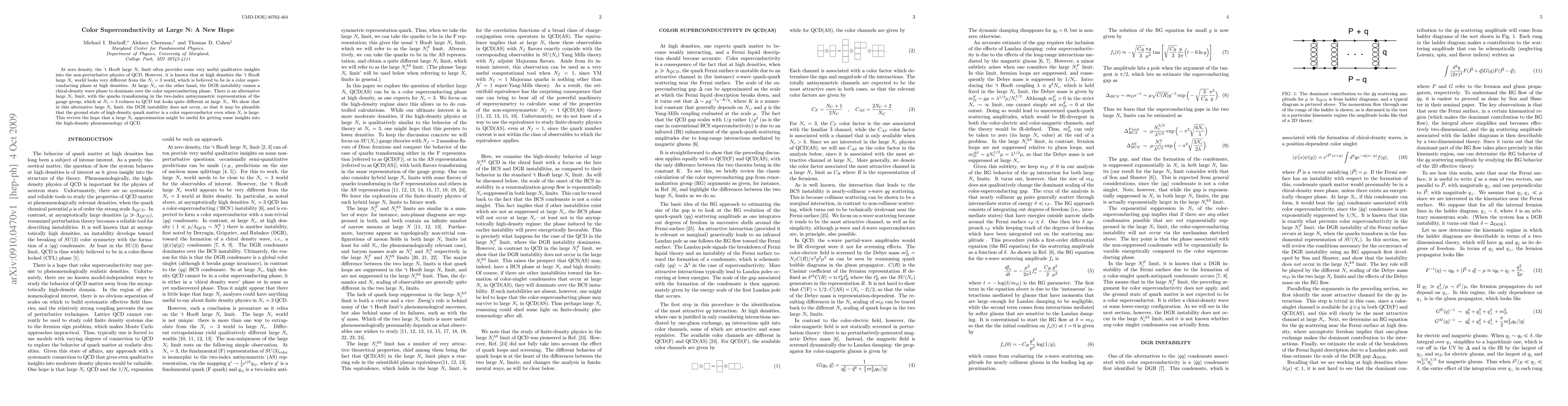 At zero density, the `t Hooft large N_c limit often provides some very useful qualitative insights into the non-perturbative physics of QCD. However, it is known that at high densities the `t Hooft large N_c world looks very different from the N_c=3 world, which is believed to be in a color superconducting phase at high densities. At large N_c, on the other hand, the DGR instability causes a chiral-density wave phase to dominate over the color superconducting phase. There is an alternative large N_c limit, with the quarks transforming in the two-index antisymmetric representation of the gauge group, which at N_c=3 reduces to QCD but looks quite different at large N_c. We show that in this alternative large N_c limit, the DGR instability does not occur, so that it may be plausible that the ground state of high-density quark matter is a color superconductor even when N_c is large. This revives the hope that a large N_c approximation might be useful for getting some insights into the high-density phenomenology of QCD.