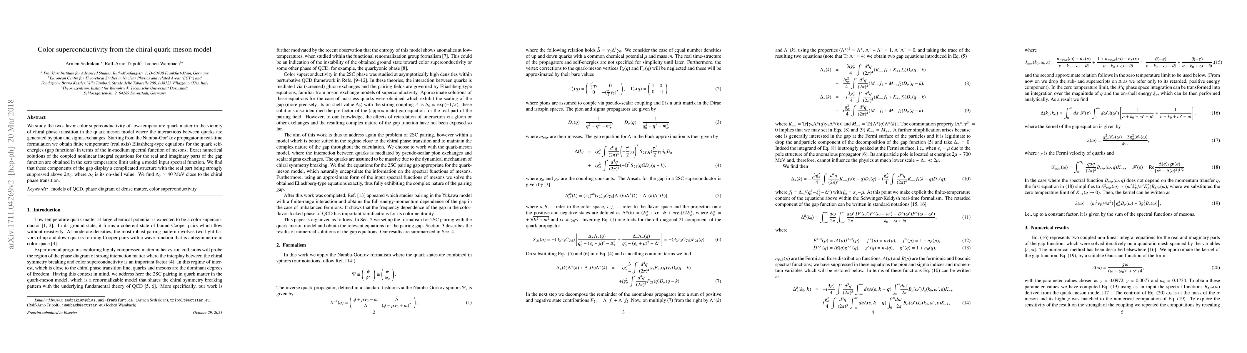 We study the two-flavor color superconductivity of low-temperature quark matter in the vicinity of chiral phase transition in the quark-meson model where the interactions between quarks are generated by pion and sigma exchanges. Starting from the Nambu-Gor'kov propagator in real-time formulation we obtain finite temperature (real axis) Eliashberg-type equations for the quark self-energies (gap functions) in terms of the in-medium spectral function of mesons. Exact numerical solutions of the coupled nonlinear integral equations for the real and imaginary parts of the gap function are obtained in the zero temperature limit using a model input spectral function. We find that these components of the gap display a complicated structure with the real part being strongly suppressed above $2\Delta_0$, where $\Delta_0$ is its on-shell value. We find $\Delta_0\simeq 40$ MeV close to the chiral phase transition.