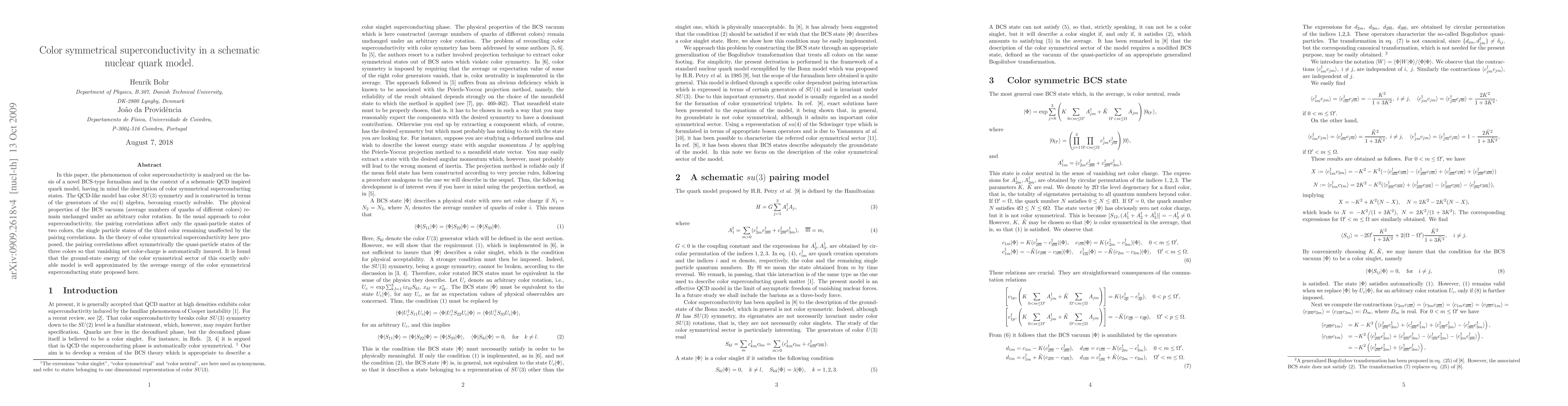 In this note, a novel BCS-type formalism is constructed in the framework of a schematic QCD inspired quark model, having in mind the description of color symmetrical superconducting states. The physical properties of the BCS vacuum (average numbers of quarks of different colors) remain unchanged under an arbitrary color rotation. In the usual approach to color superconductivity, the pairing correlations affect only the quasi-particle states of two colors, the single particle states of the third color remaining unaffected by the pairing correlations. In the theory of color symmetrical superconductivity here proposed, the pairing correlations affect symmetrically the quasi-particle states of the three colors and vanishing net color-charge is automatically insured. It is found that the groundstate energy of the color symmetrical sector of the Bonn model is well approximated by the average energy of the color symmetrical superconducting state proposed here.