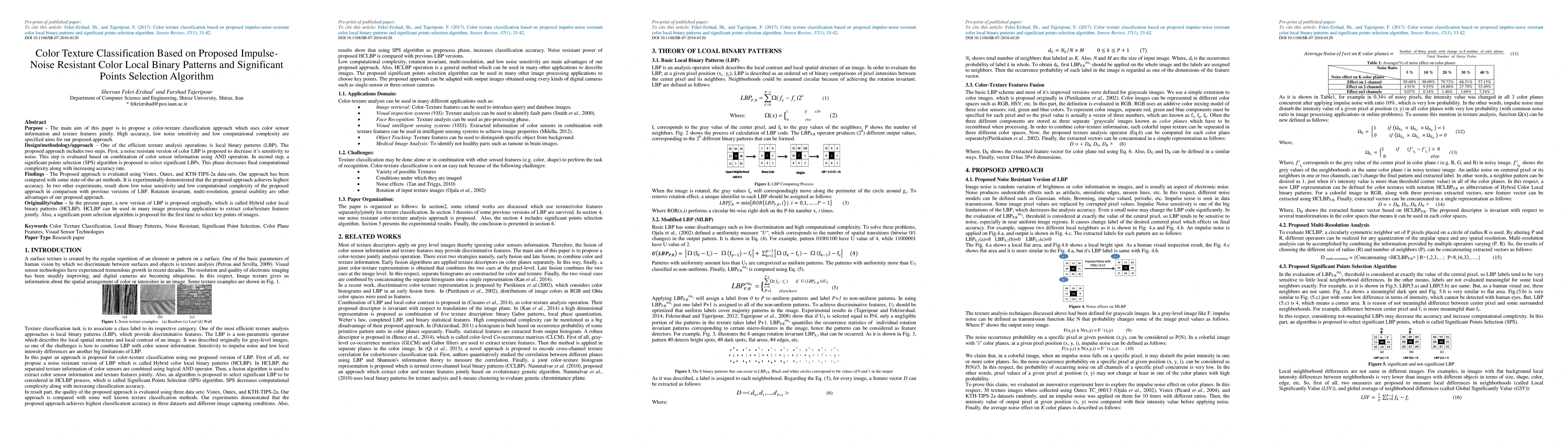This paper proposes a color texture classification method using a hybrid color local binary patterns (LBP) approach that is resistant to impulse noise, combined with a significant points selection algorithm to enhance accuracy and reduce computational complexity. Experimental results show that the method achieves high accuracy, low noise sensitivity, and is computationally efficient compared to other state-of-the-art methods.