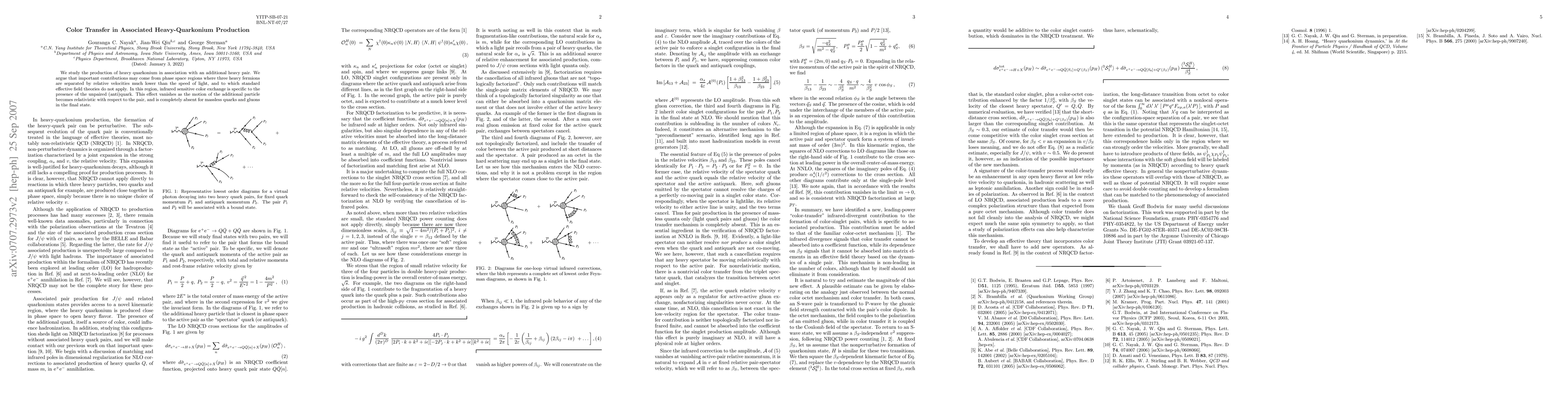 We study the production of heavy quarkonium in association with an additional heavy pair. We argue that important contributions may come from phase space regions where three heavy fermions are separated by relative velocities much lower than the speed of light, and to which standard effective field theories do not apply. In this region, infrared sensitive color exchange is specific to the presence of the unpaired (anti)quark. This effect vanishes as the motion of the additional particle becomes relativistic with respect to the pair, and is completely absent for massless quarks and gluons in the final state.