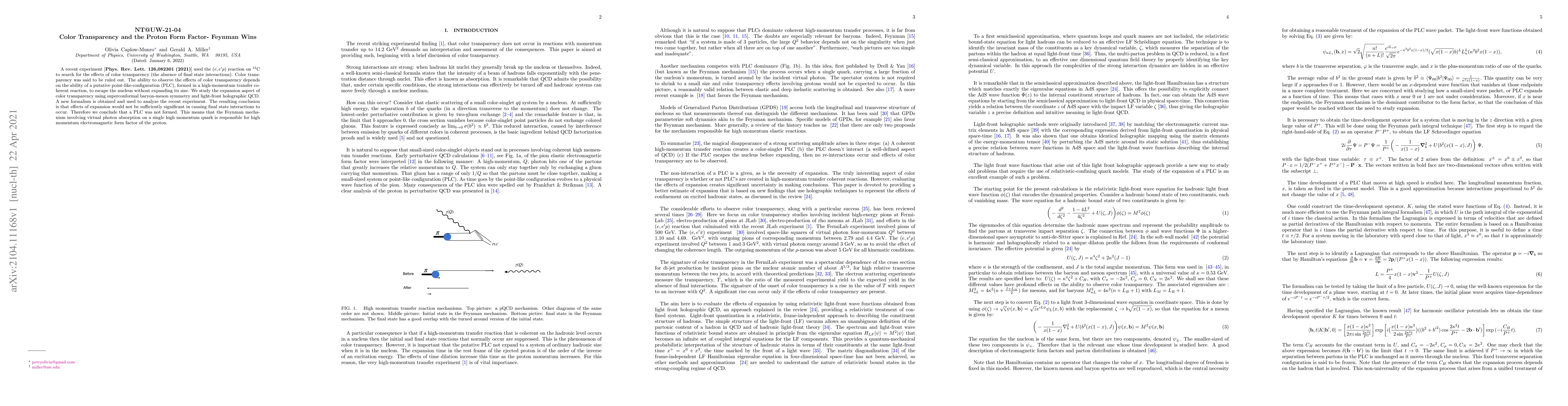 A recent experiment [{\bf Phys. Rev. Lett. 126,082301 (2021)}] used the $(e,e'p)$ reaction on $^{12}$C to search for the effects of color transparency (the absence of final state interactions). Color transparency was said to be ruled out. The ability to observe the effects of color transparency depends on the ability of a putative point-like-configuration (PLC), formed in a high-momentum transfer coherent reaction, to escape the nucleus without expanding its size. We study the expansion aspect of color transparency using superconformal baryon-meson symmetry and light-front holographic QCD. A new formalism is obtained and used to analyze the recent experiment. The resulting conclusion is that effects of expansion would not be sufficiently significant in causing final state interactions to occur. Therefore we conclude that a PLC was not formed. This means that the Feynman mechanism involving virtual photon absorption on a single high momentum quark is responsible for high momentum electromagnetic form factor of the proton.