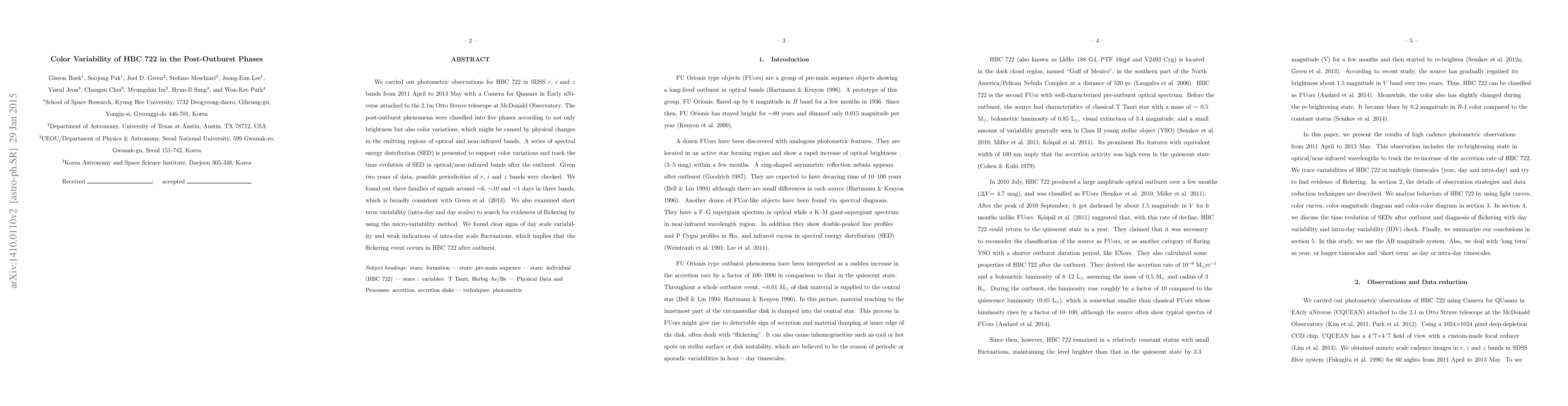 This research paper analyzes color variability of HBC 722 after a quasar outburst, finding periodic signals in brightness and color changes that may indicate physical changes in the emitting regions.