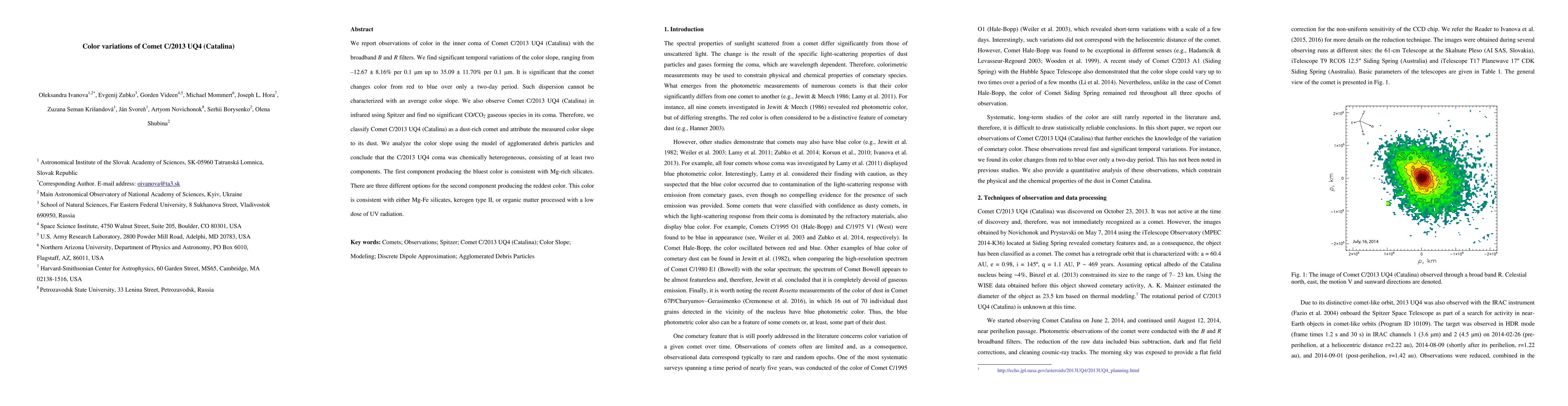 We report observations of color in the inner coma of Comet C/2013 UQ4 (Catalina) with the broadband B and R filters. We find significant temporal variations of the color slope, ranging from -12.67 $\pm$ 8.16 \% per 0.1~$\mu$m up to $35.09 \pm 11.7$ \% per 0.1~$\mu$m.It is significant that the comet changes color from red to blue over only a two-day period. Such dispersion cannot be characterized with an average color slope. We also observe Comet C/2013 UQ4 (Catalina) in infrared using Spitzer and find no significant CO/CO$_{2}$ gaseous species in its coma. Therefore, we classify Comet C/2013 UQ4 (Catalina) as a dust-rich comet and attribute the measured color slope to its dust. We analyze the color slope using the model of agglomerated debris particles and conclude that the C/2013 UQ4 coma was chemically heterogeneous, consisting of at least two components. The first component producing the bluest color is consistent with Mg-rich silicates. There are three different options for the second component producing the reddest color. This color is consistent with either Mg-Fe silicates, kerogen type II, or organic matter processed with a low dose of UV radiation.