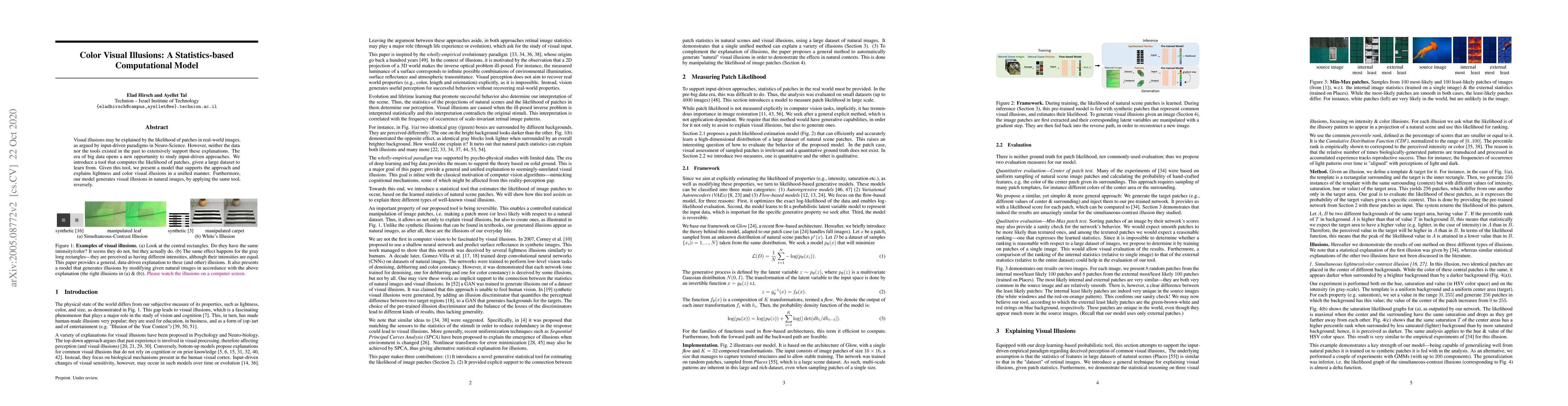 The paper introduces a computational model leveraging big data to explain color and lightness visual illusions through the likelihood of image patches, generating illusions by reversing the model's learning. This statistics-based approach unifies explanations for various visual illusions.