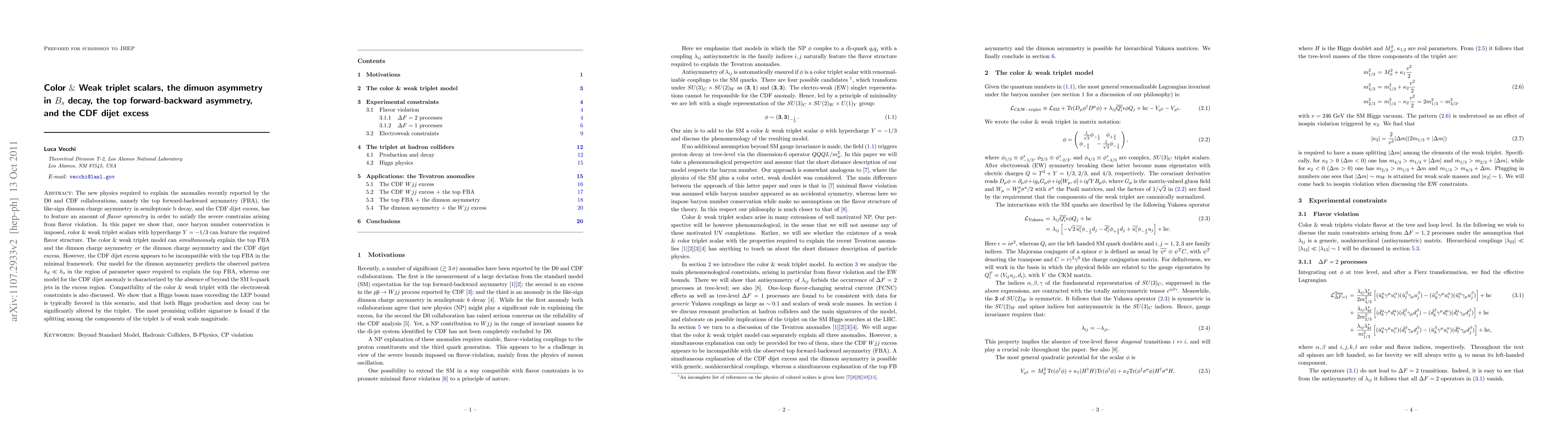 The new physics required to explain the anomalies recently reported by the D0 and CDF collaborations, namely the top forward-backward asymmetry (FBA), the like-sign dimuon charge asymmetry in semileptonic b decay, and the CDF dijet excess, has to feature an amount of flavor symmetry in order to satisfy the severe constrains arising from flavor violation. In this paper we show that, once baryon number conservation is imposed, color & weak triplet scalars with hypercharge $Y=1/3$ can feature the required flavor structure as a consequence of standard model gauge invariance. The color & weak triplet model can simultaneously explain the top FBA and the dimuon charge asymmetry or the dimuon charge asymmetry and the CDF dijet excess. However, the CDF dijet excess appears to be incompatible with the top FBA in the minimal framework. Our model for the dimuon asymmetry predicts the observed pattern $h_d\ll h_s$ in the region of parameter space required to explain the top FBA, whereas our model for the CDF dijet anomaly is characterized by the absence of beyond the SM b-quark jets in the excess region. Compatibility of the color & weak triplet with the electroweak constraints is also discussed. We show that a Higgs boson mass exceeding the LEP bound is typically favored in this scenario, and that both Higgs production and decay can be significantly altered by the triplet. The most promising collider signature is found if the splitting among the components of the triplet is of weak scale magnitude.