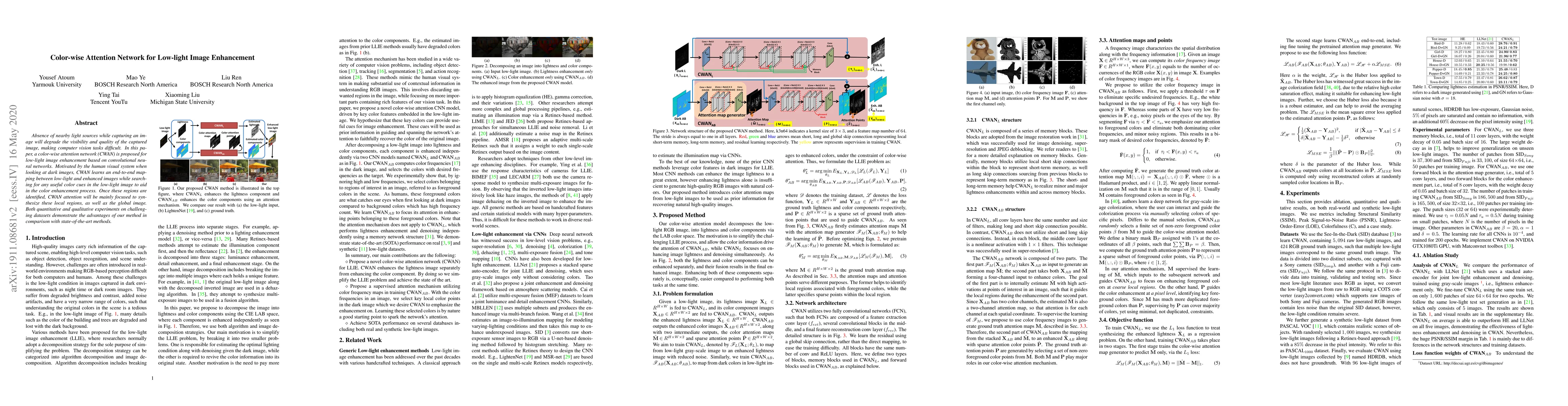 The paper proposes a color-wise attention network (CWAN) for enhancing low-light images using convolutional neural networks, mimicking human visual focus on color cues. Experiments show CWAN outperforms state-of-the-art methods in both quantitative and qualitative assessments.