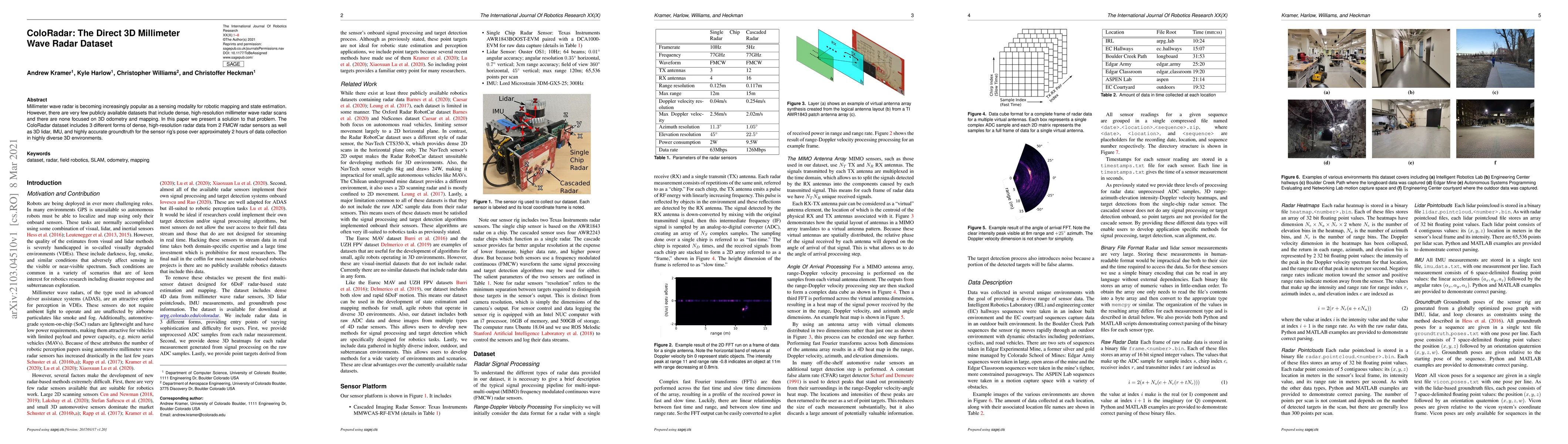 ColoRadar provides a comprehensive dataset featuring dense, high-resolution millimeter wave radar scans and 3D lidar, IMU, and ground truth data for 3D odometry and mapping in complex environments over two hours of collection. It aims to address the scarcity of public datasets for advanced robotic applications.