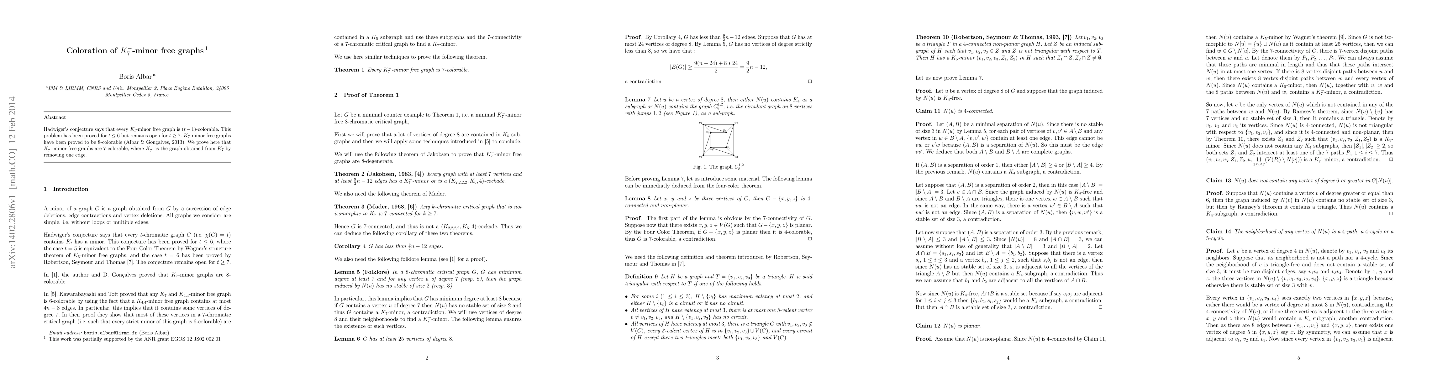 Researchers prove that $K_7^-$-minor free graphs can be colored with 7 colors, resolving the conjecture for $t eq 6$.