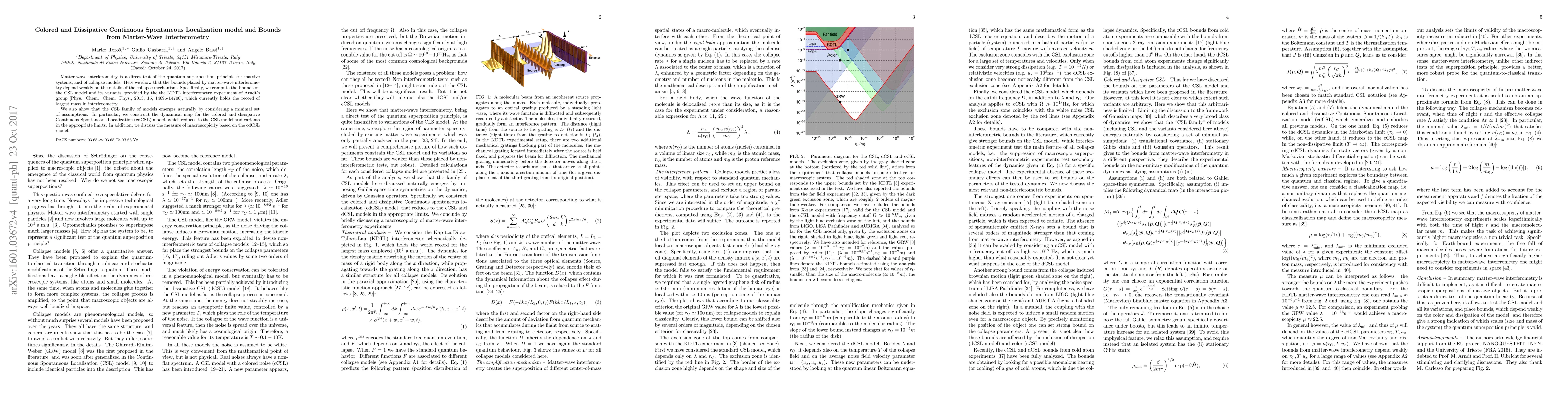 Matter-wave interferometry is a direct test of the quantum superposition principle for massive systems, and of collapse models. Here we show that the bounds placed by matter-wave interferometry depend weakly on the details of the collapse mechanism. Specifically, we compute the bounds on the CSL model and its variants, provided by the the KDTL interferometry experiment of Arndt's group [Phys. Chem. Chem. Phys., 2013, 15, 14696-14700], which currently holds the record of largest mass in interferometry. We also show that the CSL family of models emerges naturally by considering a minimal set of assumptions. In particular, we construct the dynamical map for the colored and dissipative Continuous Spontaneous Localization (cdCSL) model, which reduces to the CSL model and variants in the appropriate limits. In addition, we discuss the measure of macroscopicity based on the cdCSL model.