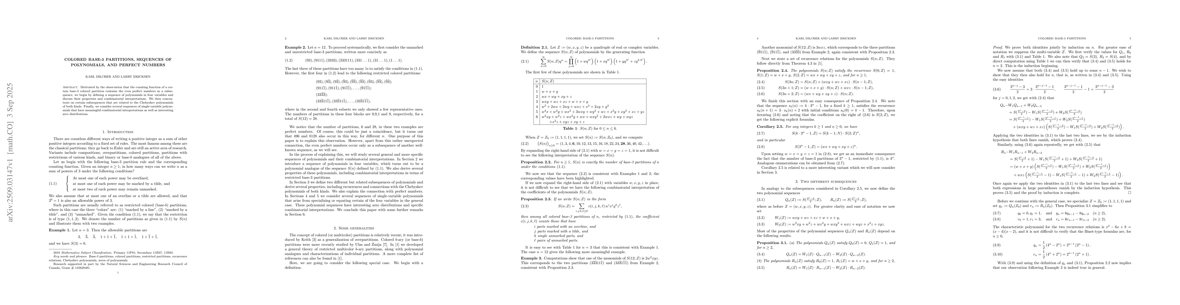 Motivated by the observation that the counting function of a certain base-3 colored partition contains the even perfect numbers as a subsequence, we begin by defining a sequence of polynomials in four variables and discuss their properties and combinatorial interpretations. We then concentrate on certain subsequences that are related to the Chebyshev polynomials of both kinds. Finally, we consider several sequences of single-variable polynomials that have meaningful combinatorial interpretations as well as interesting zero distributions.