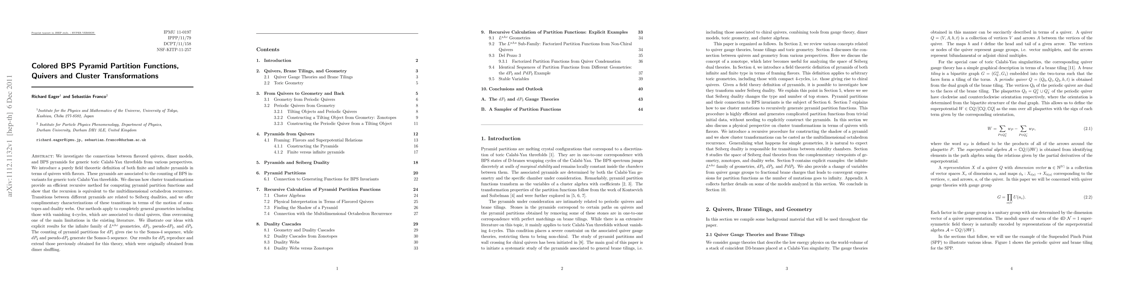 We investigate the connections between flavored quivers, dimer models, and BPS pyramids for generic toric Calabi-Yau threefolds from various perspectives. We introduce a purely field theoretic definition of both finite and infinite pyramids in terms of quivers with flavors. These pyramids are associated to the counting of BPS invariants for generic toric Calabi-Yau threefolds. We discuss how cluster transformations provide an efficient recursive method for computing pyramid partition functions and show that the recursion is equivalent to the multidimensional octahedron recurrence. Transitions between different pyramids are related to Seiberg dualities, and we offer complimentary characterizations of these transitions in terms of the motion of zonotopes and duality webs. Our methods apply to completely general geometries including those with vanishing 4-cycles, which are associated to chiral quivers, thus overcoming one of the main limitations in the existing literature. We illustrate our ideas with explicit results for the infinite family of L^{a,b,c} geometries, dP_2, pseudo-dP_2, and dP_3. The counting of pyramid partitions for dP_1 gives rise to the Somos-4 sequence, while dP_2 and pseudo-dP_2 generate the Somos-5 sequence. Our results for dP_3 reproduce and extend those previously obtained for this theory, which were originally obtained from dimer shuffling.