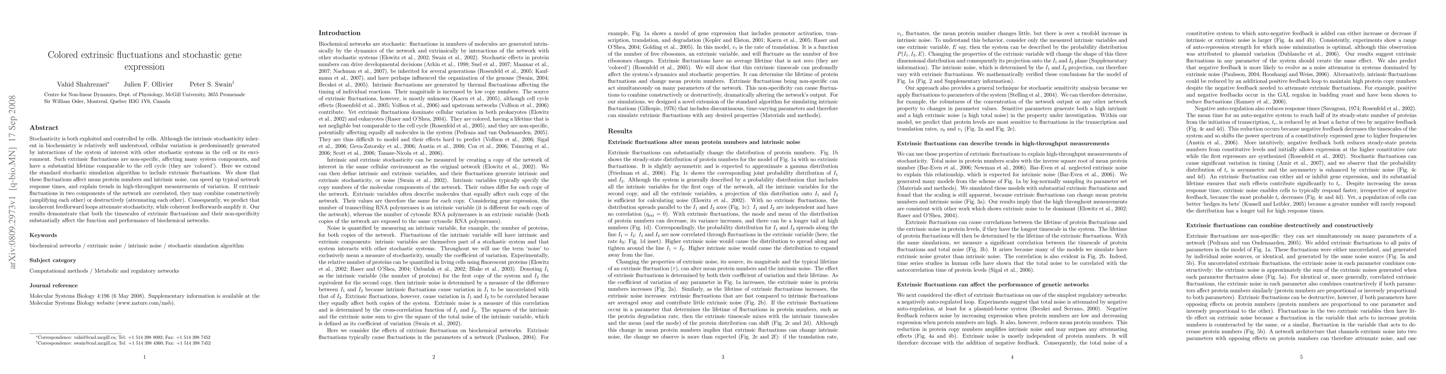 Stochasticity is both exploited and controlled by cells. Although the intrinsic stochasticity inherent in biochemistry is relatively well understood, cellular variation, or 'noise', is predominantly generated by interactions of the system of interest with other stochastic systems in the cell or its environment. Such extrinsic fluctuations are nonspecific, affecting many system components, and have a substantial lifetime, comparable to the cell cycle (they are 'colored'). Here, we extend the standard stochastic simulation algorithm to include extrinsic fluctuations. We show that these fluctuations affect mean protein numbers and intrinsic noise, can speed up typical network response times, and can explain trends in high-throughput measurements of variation. If extrinsic fluctuations in two components of the network are correlated, they may combine constructively (amplifying each other) or destructively (attenuating each other). Consequently, we predict that incoherent feedforward loops attenuate stochasticity, while coherent feedforwards amplify it. Our results demonstrate that both the timescales of extrinsic fluctuations and their nonspecificity substantially affect the function and performance of biochemical networks.