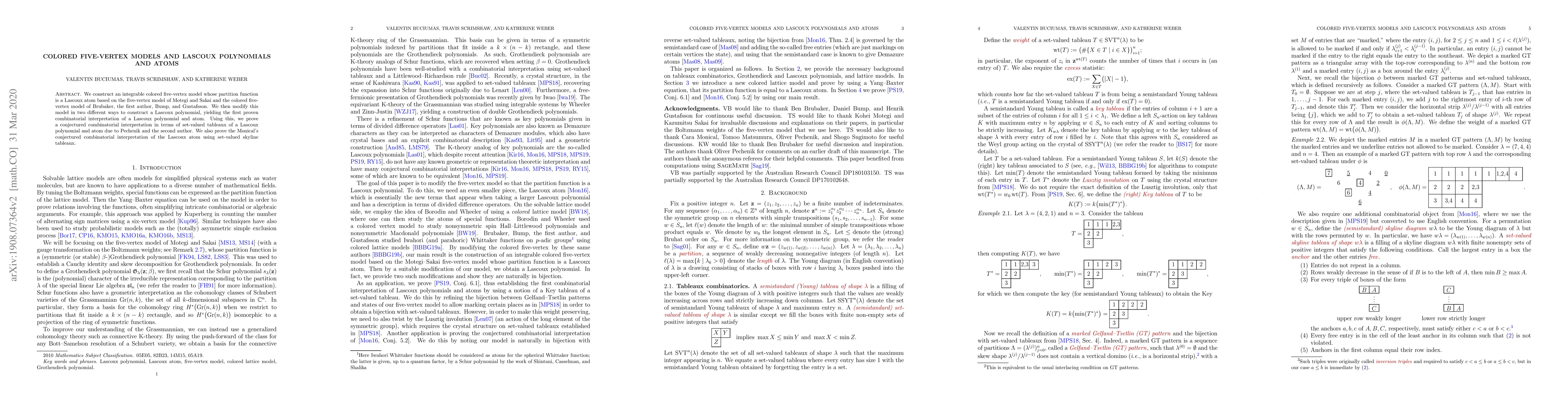 This paper constructs an integrable colored five-vertex model with a partition function that is a Lascoux atom, extending the work of Motegi and Sakai. It further modifies the model to provide the first combinatorial interpretations of Lascoux polynomials and atoms, proving conjectures by Pechenik and the authors.