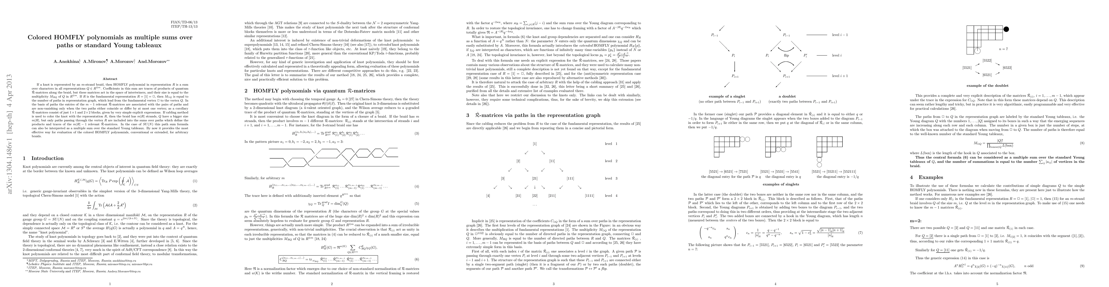 If a knot is represented by an m-strand braid, then HOMFLY polynomial in representation R is a sum over characters in all representations Q\in R^{\otimes m}. Coefficients in this sum are traces of products of quantum R-matrices along the braid, but these matrices act in the space of intertwiners, and their size is equal to the multiplicity M_{RQ} of Q in R^{\otimes m}. If R is the fundamental representation R=[1], then M_{[1] Q} is equal to the number of paths in representation graph, which lead from the fundamental vertex [1] to the vertex Q. In the basis of paths the entries of the m-1 relevant R-matrices are associated with the pairs of paths and are non-vanishing only when the two paths either coincide or differ by at most one vertex; as a corollary R-matrices consist of just 1x1 and 2x2 blocks, given by very simple explicit expressions. If cabling method is used to color the knot with the representation R, then the braid has m|R| strands, Q have a bigger size m|R|, but only paths passing through the vertex R are included into the sums over paths which define the products and traces of the m|R|-1 relevant R-matrices. In the case of SU(N) this path sum formula can also be interpreted as a multiple sum over the standard Young tableaux. By now it provides the most effective way for evaluation of the colored HOMFLY polynomials, conventional or extended, for arbitrary braids.