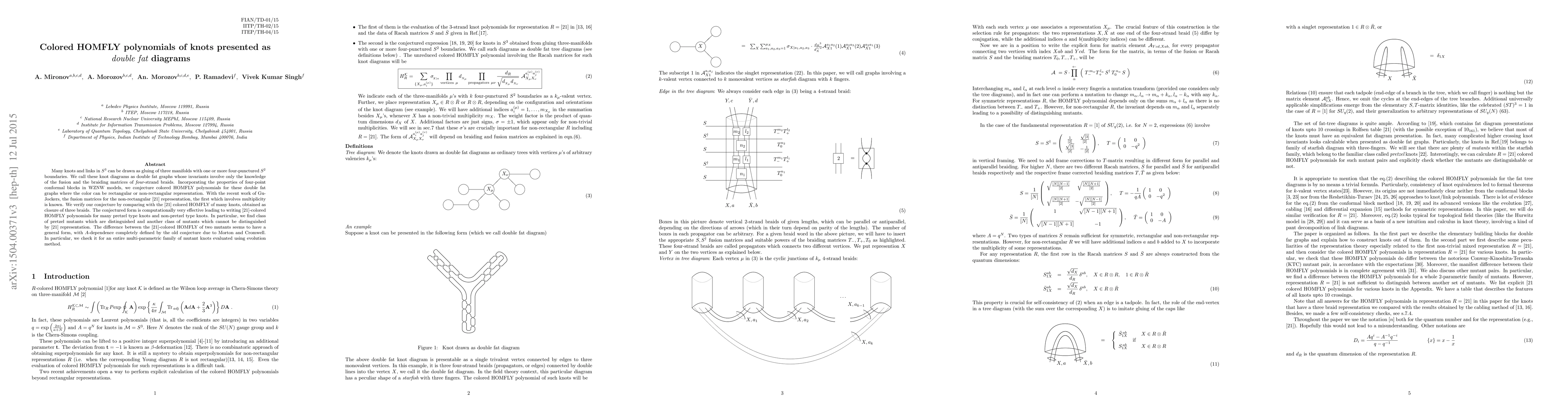 Many knots and links in S^3 can be drawn as gluing of three manifolds with one or more four-punctured S^2 boundaries. We call these knot diagrams as double fat graphs whose invariants involve only the knowledge of the fusion and the braiding matrices of four-strand braids. Incorporating the properties of four-point conformal blocks in WZNW models, we conjecture colored HOMFLY polynomials for these double fat graphs where the color can be rectangular or non-rectangular representation. With the recent work of Gu-Jockers, the fusion matrices for the non-rectangular [21] representation, the first which involves multiplicity is known. We verify our conjecture by comparing with the [21] colored HOMFLY of many knots, obtained as closure of three braids. The conjectured form is computationally very effective leading to writing [21]-colored HOMFLY polynomials for many pretzel type knots and non-pretzel type knots. In particular, we find class of pretzel mutants which are distinguished and another class of mutants which cannot be distinguished by [21] representation. The difference between the [21]-colored HOMFLY of two mutants seems to have a general form, with A-dependence completely defined by the old conjecture due to Morton and Cromwell. In particular, we check it for an entire multi-parametric family of mutant knots evaluated using evolution method.