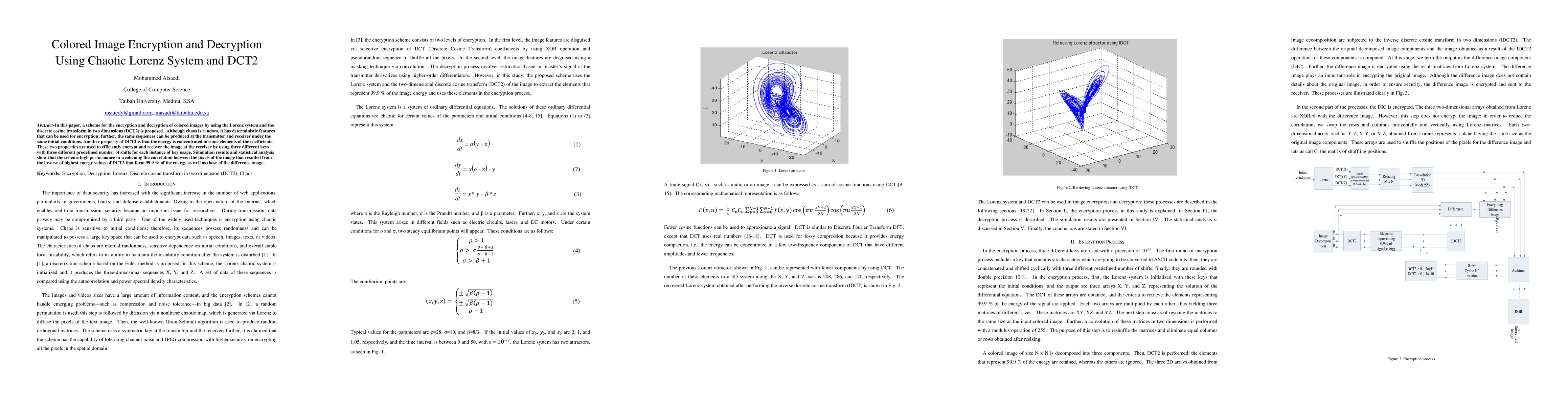 In this paper, a scheme for the encryption and decryption of colored images by using the Lorenz system and the discrete cosine transform in two dimensions (DCT2) is proposed. Although chaos is random, it has deterministic features that can be used for encryption; further, the same sequences can be produced at the transmitter and receiver under the same initial conditions. Another property of DCT2 is that the energy is concentrated in some elements of the coefficients. These two properties are used to efficiently encrypt and recover the image at the receiver by using three different keys with three different predefined number of shifts for each instance of key usage. Simulation results and statistical analysis show that the scheme high performance in weakening the correlation between the pixels of the image that resulted from the inverse of highest energy values of DCT2 that form 99.9 % of the energy as well as those of the difference image.