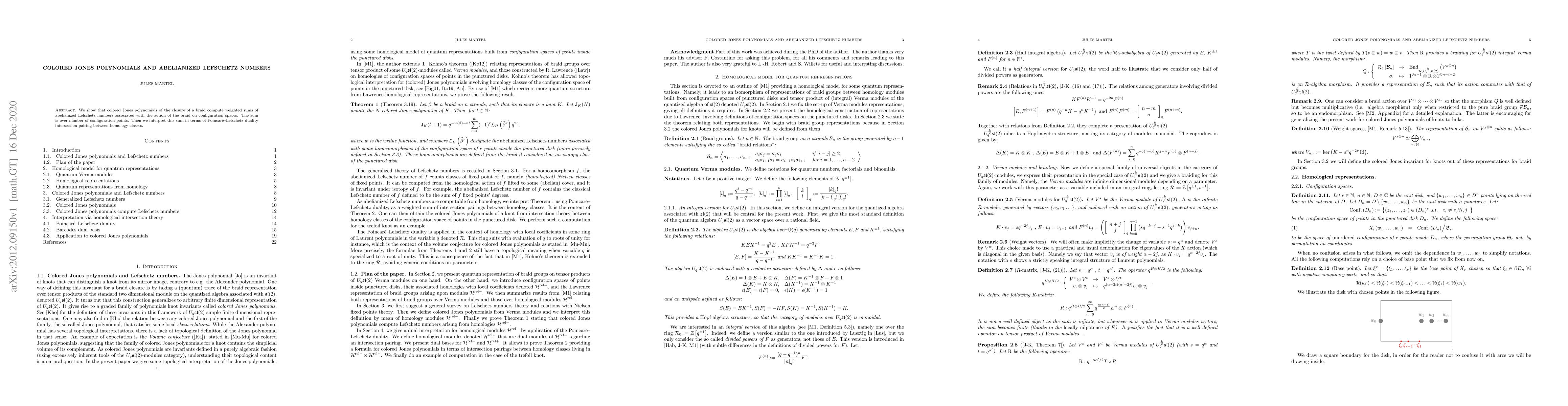 We show that the family of colored Jones polynomials of the closure of a braid compute weighted sums of abelianized Lefschetz numbers associated with the action of the braid on configuration spaces. The sum is over the number of configuration points. Then we interpret this sum in terms of Poincare--Lefschetz duality intersection pairing between homology classes.