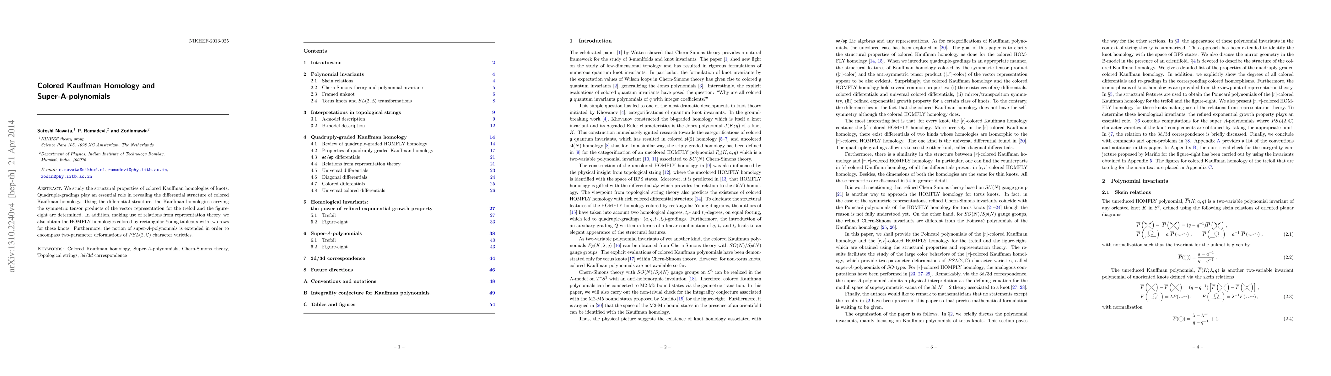 This paper explores the structural properties of colored Kauffman homologies of knots, emphasizing quadruple-gradings to reveal differential structures. It determines the Kauffman homologies for the trefoil and figure-eight and extends super-A-polynomials to include two-parameter deformations of PSL(2,C) character varieties using representation theory.