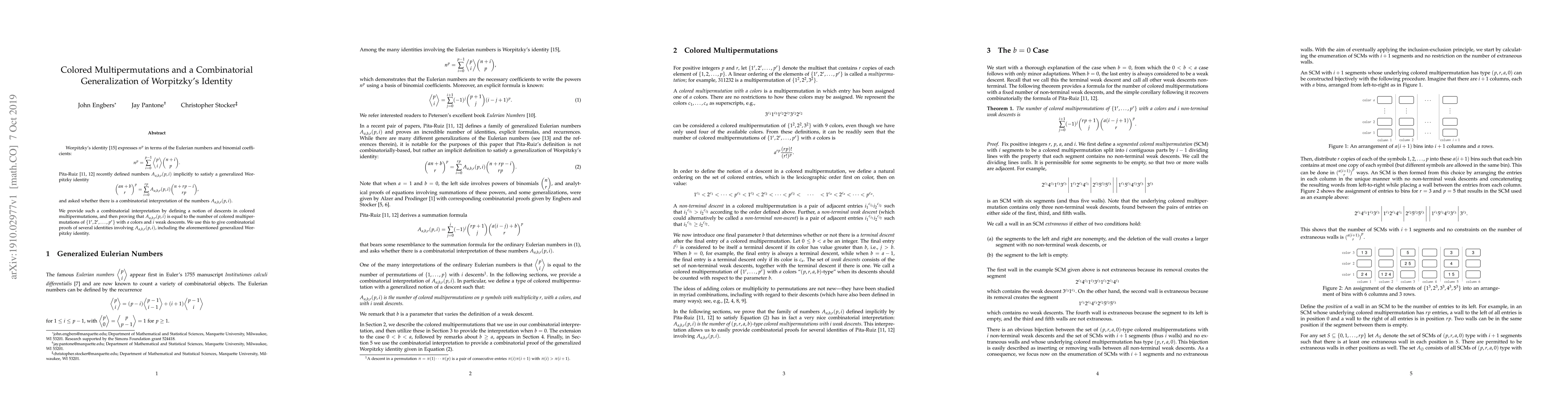 This paper provides a combinatorial interpretation of the numbers $A_{a,b,r}(p,i)$ defined by Pita-Ruiz, showing they count colored multipermutations of $\{1^r, 2^r, \ldots, p^r\}$ with $a$ colors and $i$ weak descents, and uses this to prove several identities, including a generalized Worpitzky identity.