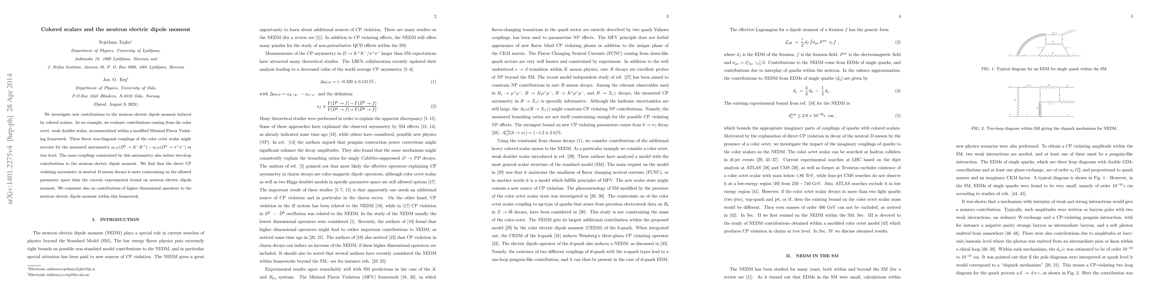 This paper explores new contributions to the neutron electric dipole moment (EDM) from colored scalars, specifically a color octet, weak doublet scalar within a modified Minimal Flavor Violating framework. It finds that these contributions are comparable to experimental bounds and discusses the implications for CP-violating asymmetries in charm decays.
