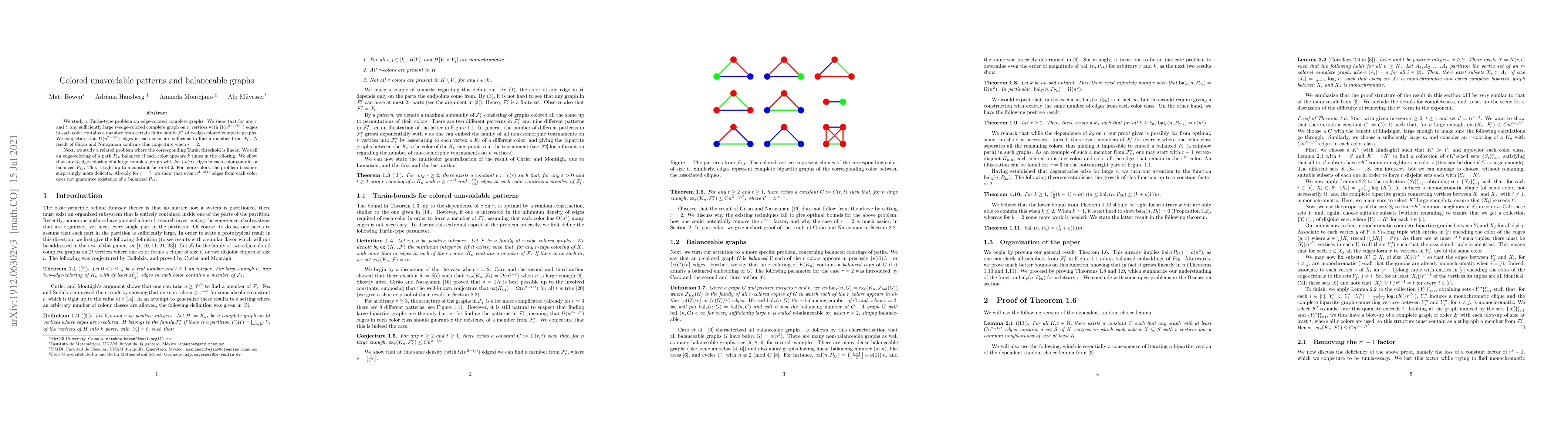 This research explores two problems related to edge-colored complete graphs. Firstly, it establishes that for sufficiently large graphs with r colors, each having Ω(n^(2-1/tr^r)) edges, a member of a specific finite family of r-edge-colored complete graphs must exist. The authors conjecture that Ω(n^(2-1/t)) edges per color would suffice, which is proven for r=2. Secondly, the study examines balanced edge-colorings of paths in complete graphs, proving that a 3-edge-colored large graph with kn+o(n) edges per color contains a balanced P_{3k}, with tightness guaranteed. However, for more colors like r=7, even n^(2-o(1)) edges per color may not ensure a balanced P_{7k}.