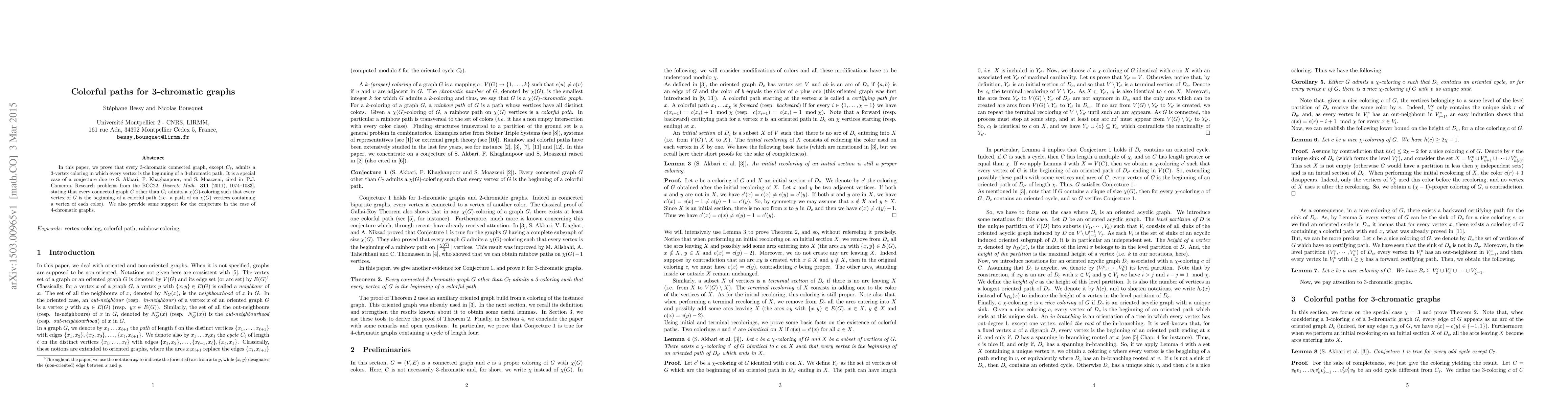 In this paper, we prove that every 3-chromatic connected graph, except $C_7$, admits a 3-vertex coloring in which every vertex is the beginning of a 3-chromatic path. It is a special case of a conjecture due to S.~Akbari, F.~Khaghanpoor, and S.~Moazzeni, cited in [P.J. Cameron, Research problems from the BCC22, \emph{Discrete Math.} {\bf 311} (2011), 1074--1083], stating that every connected graph $G$ other than $C_7$ admits a $\chi (G)$-coloring such that every vertex of $G$ is the beginning of a colorful path (i.e. a path of on $\chi(G)$ vertices containing a vertex of each color). We also provide some support for the conjecture in the case of 4-chromatic graphs.