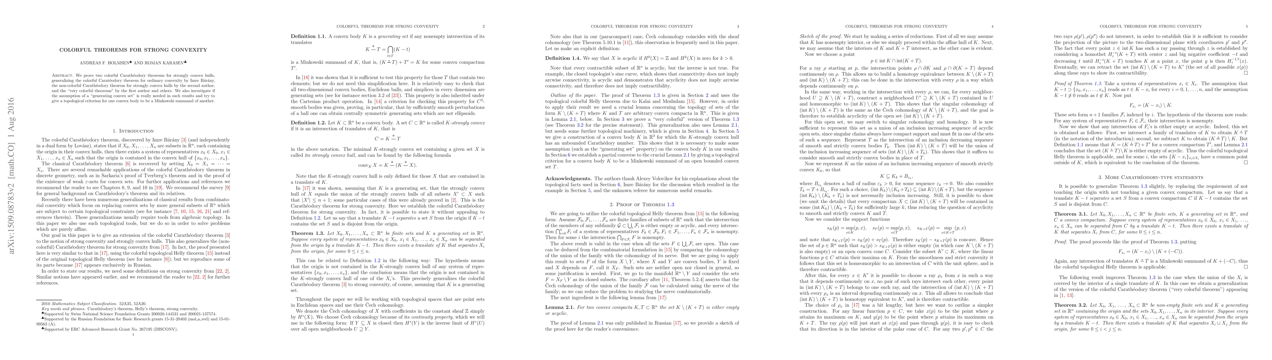 This paper presents two generalized colorful Carathéodory theorems for strongly convex hulls, extending previous results on ordinary convexity and strongly convex sets. It also explores the necessity of a "generating convex set" and proposes a topological criterion for Minkowski summands.