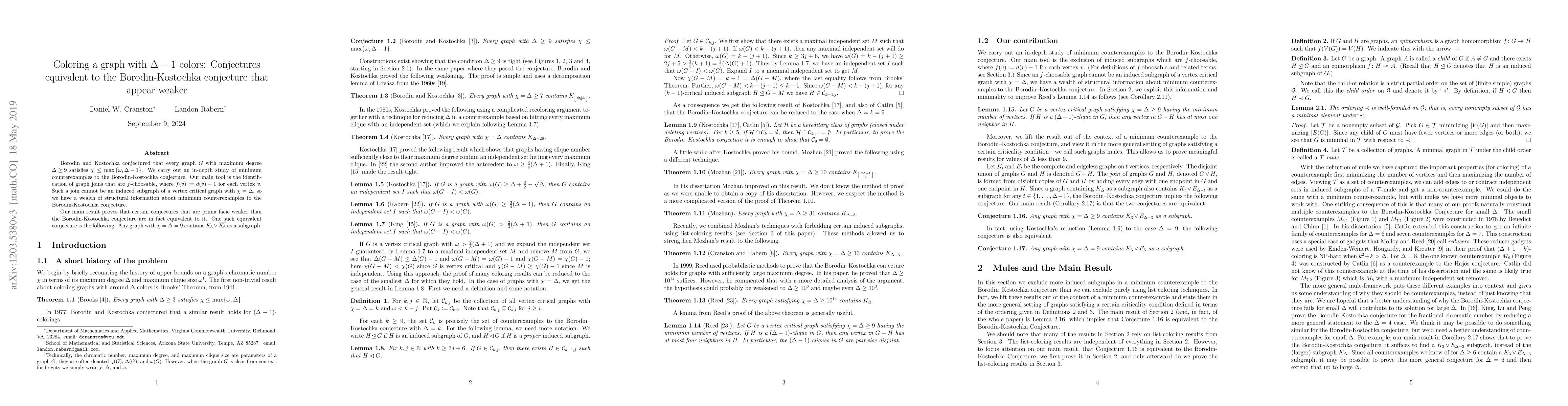 Borodin and Kostochka conjectured that every graph $G$ with maximum degree $\Delta \ge 9$ satisfies $\chi \le \max\{\omega, \Delta-1\}$. We carry out an in-depth study of minimum counterexamples to the Borodin-Kostochka conjecture. Our main tool is the identification of graph joins that are $f$-choosable, where $f(v) = d(v) - 1$ for each vertex $v$. Since such a join cannot be an induced subgraph of a vertex critical graph with $\chi = \Delta$, we have a wealth of structural information about minimum counterexamples to the Borodin-Kostochka conjecture. Our main result proves that certain conjectures that are prima facie weaker than the Borodin-Kostochka conjecture are in fact equivalent to it. One such equivalent conjecture is the following: Any graph with $\chi \ge \Delta = 9$ contains $K_3 * \bar{K_6}$ as a subgraph.