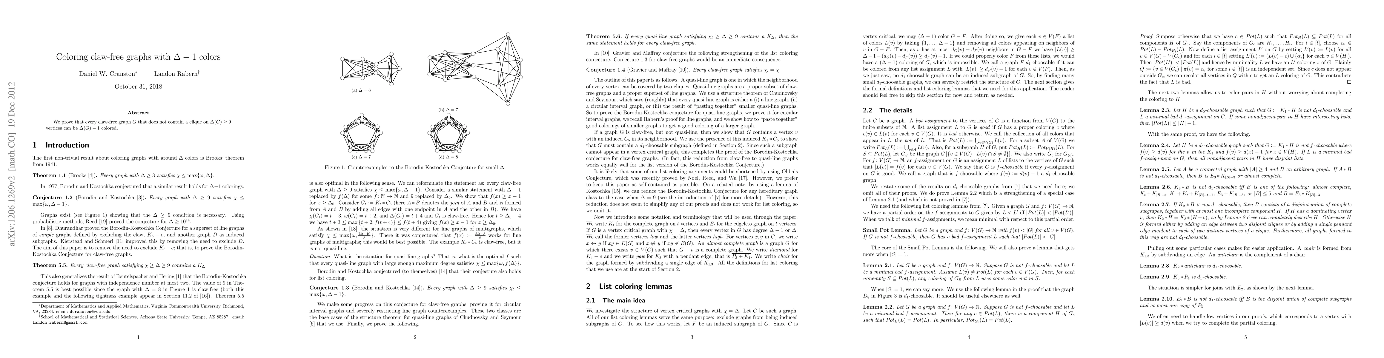 We prove that every claw-free graph $G$ that doesn't contain a clique on $\Delta(G) \geq 9$ vertices can be $\Delta(G) - 1$ colored.