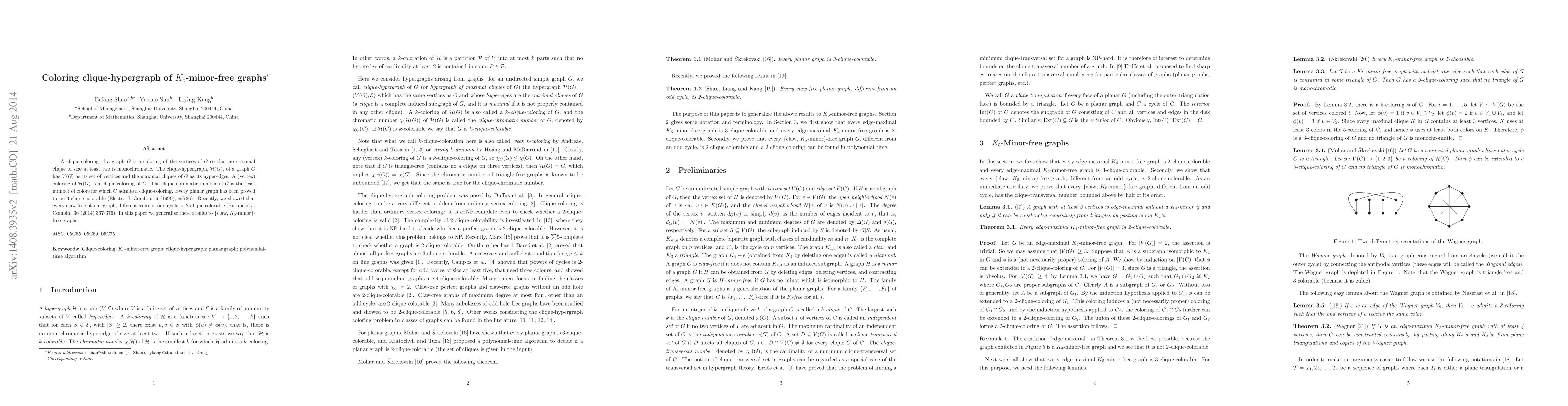 A clique-coloring of a graph $G$ is a coloring of the vertices of $G$ so that no maximal clique of size at least two is monochromatic. The clique-hypergraph, $\mathcal{H}(G)$, of a graph $G$ has $V(G)$ as its set of vertices and the maximal cliques of $G$ as its hyperedges. A (vertex) coloring of $\mathcal{H}(G)$ is a clique-coloring of $G$. The clique-chromatic number of $G$ is the least number of colors for which $G$ admits a clique-coloring. Every planar graph has been proved to be 3-clique-colorable (Electr. J. Combin. 6 (1999), \#R26). Recently, we showed that every claw-free planar graph, different from an odd cycle, is $2$-clique-colorable (European J. Combin. 36 (2014) 367-376). In this paper we generalize these results to \{claw, $K_5$-minor\}-free graphs.