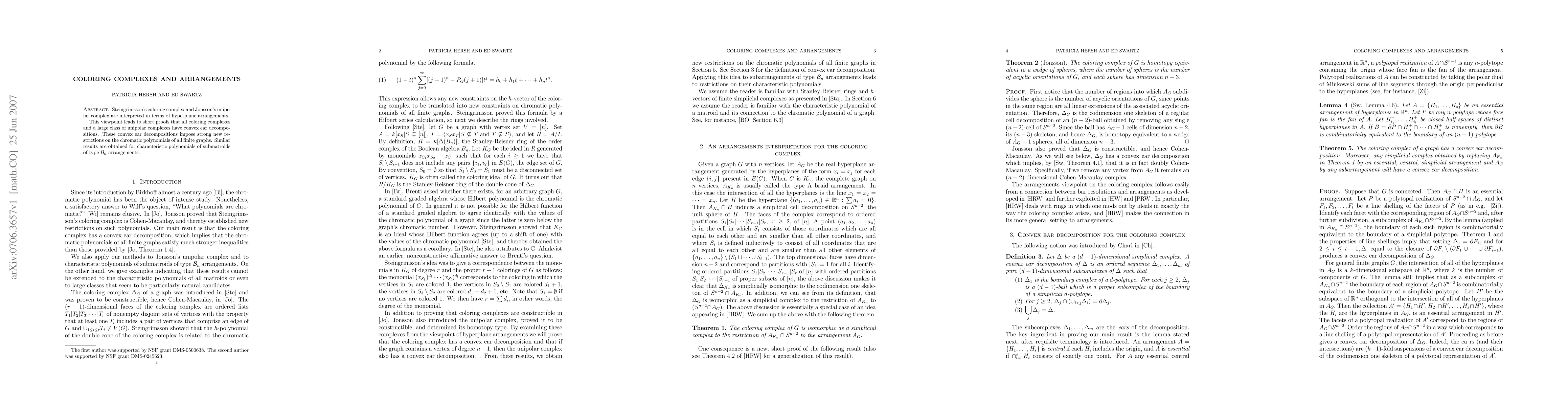 Steingrimsson's coloring complex and Jonsson's unipolar complex are interpreted in terms of hyperplane arrangements. This viewpoint leads to short proofs that all coloring complexes and a large class of unipolar complexes have convex ear decompositions. These convex ear decompositions impose strong new restrictions on the chromatic polynomials of all finite graphs. Similar results are obtained for characteristic polynomials of submatroids of type B_n arrangements.