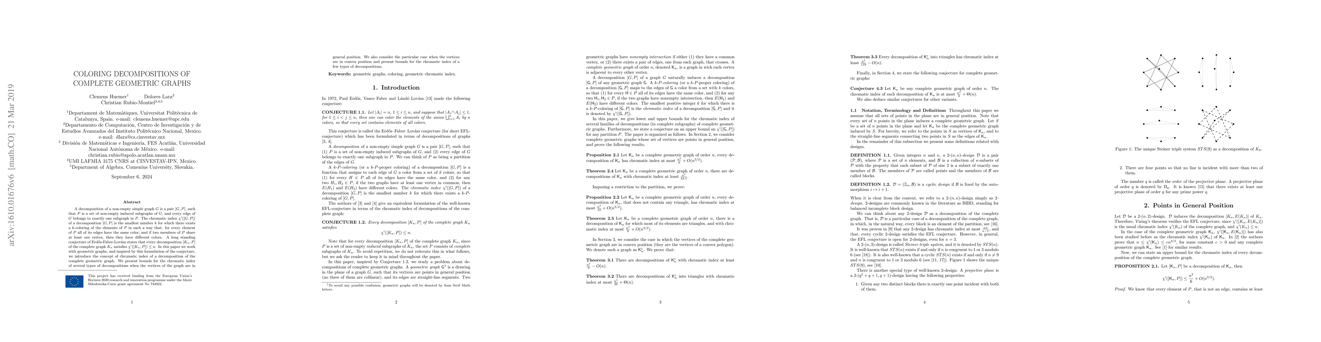 This paper explores the chromatic index of decompositions of complete geometric graphs, focusing on the conjecture that every decomposition of the complete graph $K_n$ satisfies $\chi'([K_n,P])\leq n$. The authors introduce the concept of chromatic index for geometric graph decompositions and provide bounds for various types of decompositions when vertices are in general or convex positions.