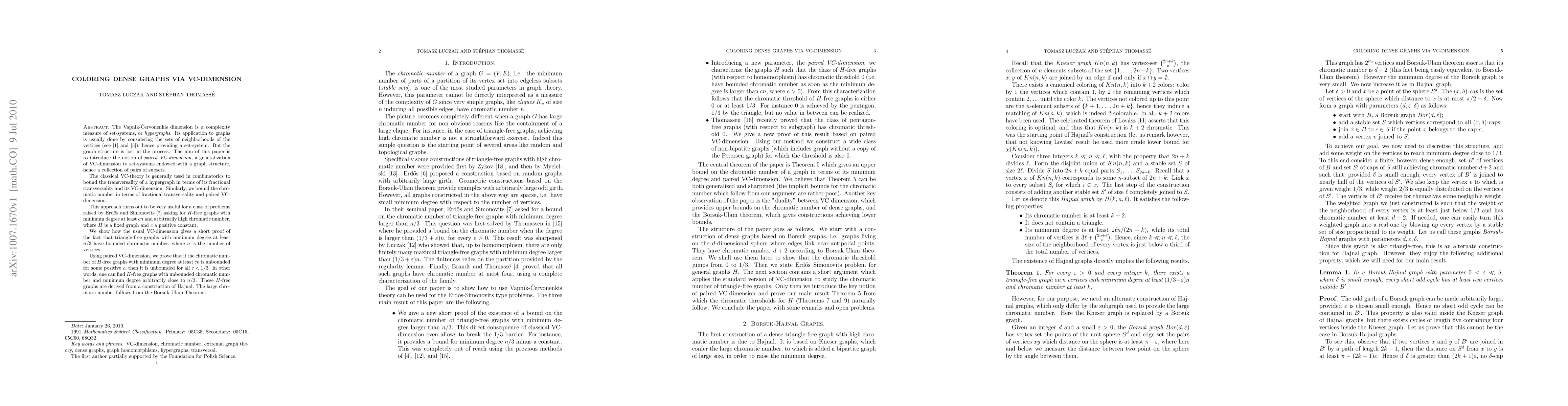 The Vapnik-\v{C}ervonenkis dimension is a complexity measure of set-systems, or hypergraphs. Its application to graphs is usually done by considering the sets of neighborhoods of the vertices (cf. Alon et al. (2006) and Chepoi, Estellon, and Vaxes (2007)), hence providing a set-system. But the graph structure is lost in the process. The aim of this paper is to introduce the notion of paired VC-dimension, a generalization of VC-dimension to set-systems endowed with a graph structure, hence a collection of pairs of subsets. The classical VC-theory is generally used in combinatorics to bound the transversality of a hypergraph in terms of its fractional transversality and its VC-dimension. Similarly, we bound the chromatic number in terms of fractional transversality and paired VC-dimension. This approach turns out to be very useful for a class of problems raised by Erd\H{o}s and Simonovits (1973) asking for H-free graphs with minimum degree at least cn and arbitrarily high chromatic number, where H is a fixed graph and c a positive constant. We show how the usual VC-dimension gives a short proof of the fact that triangle-free graphs with minimum degree at least n/3 have bounded chromatic number, where $n$ is the number of vertices. Using paired VC-dimension, we prove that if the chromatic number of $H$-free graphs with minimum degree at least cn is unbounded for some positive c, then it is unbounded for all c<1/3. In other words, one can find H-free graphs with unbounded chromatic number and minimum degree arbitrarily close to n/3. These H-free graphs are derived from a construction of Hajnal. The large chromatic number follows from the Borsuk-Ulam Theorem.