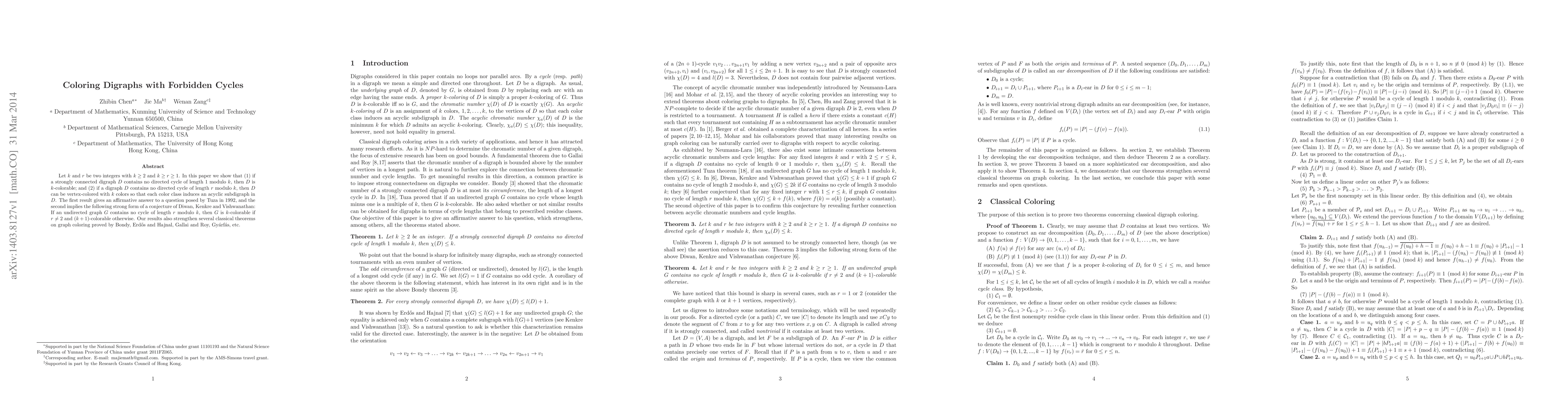 Let $k$ and $r$ be two integers with $k \ge 2$ and $k\ge r \ge 1$. In this paper we show that (1) if a strongly connected digraph $D$ contains no directed cycle of length $1$ modulo $k$, then $D$ is $k$-colorable; and (2) if a digraph $D$ contains no directed cycle of length $r$ modulo $k$, then $D$ can be vertex-colored with $k$ colors so that each color class induces an acyclic subdigraph in $D$. The first result gives an affirmative answer to a question posed by Tuza in 1992, and the second implies the following strong form of a conjecture of Diwan, Kenkre and Vishwanathan: If an undirected graph $G$ contains no cycle of length $r$ modulo $k$, then $G$ is $k$-colorable if $r\ne 2$ and $(k+1)$-colorable otherwise. Our results also strengthen several classical theorems on graph coloring proved by Bondy, Erd\H{o}s and Hajnal, Gallai and Roy, Gy\'arf\'as, etc.