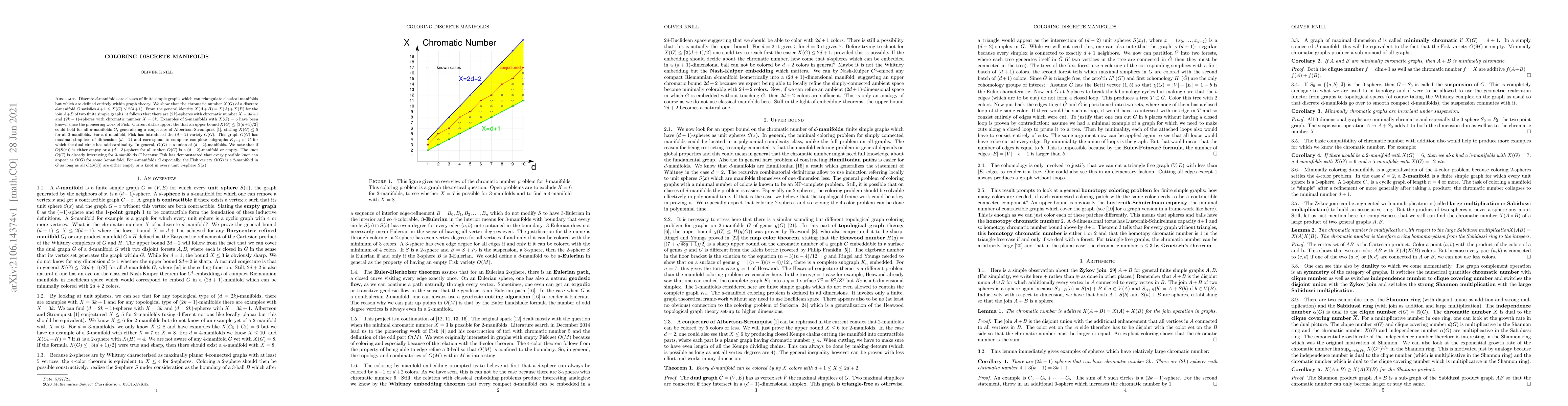 Discrete d-manifolds are classes of finite simple graphs which can triangulate classical manifolds but which are defined entirely within graph theory. We show that the chromatic number X(G) of a discrete d-manifold G is sandwiched between d+1 and 2(d+1). From the general identity X(A+B)=X(A)+X(B) for the join A+B of two finite simple graphs, it follows that there are (2k)-spheres with chromatic number X=(3k+1) and (2k-1)-spheres with chromatic number X=3k. Examples of 2-manifolds with X(G)=5 have been known since the pioneering work of Fisk. Current data support the that the ceiling function of 3(d+1)/2 could be an upper bound for all d-manifolds G, generalizing a conjecture of Albertson-Stromquist, stating X(G) is bounded above by 5 for all 2-manifolds. For a d-manifold, Fisk has introduced the (d-2)-variety O(G). This graph O(G) has maximal simplices of dimension (d-2) and correspond to complete complete subgraphs K_{d-1} of G for which the dual circle has odd cardinality. In general, O(G) is a union of (d-2)-manifolds. We note that if O(S(x)) is either empty or a (d-3)-sphere for all x then O(G) is a (d-2)-manifold or empty. The knot O(G) is already interesting for 3-manifolds G because Fisk has demonstrated that every possible knot can appear as O(G) for some 3-manifold. For 4-manifolds G especially, the Fisk variety O(G) is a 2-manifold in G as long as all O(S(x)) are either empty or a knot in every unit 3-sphere S(x).