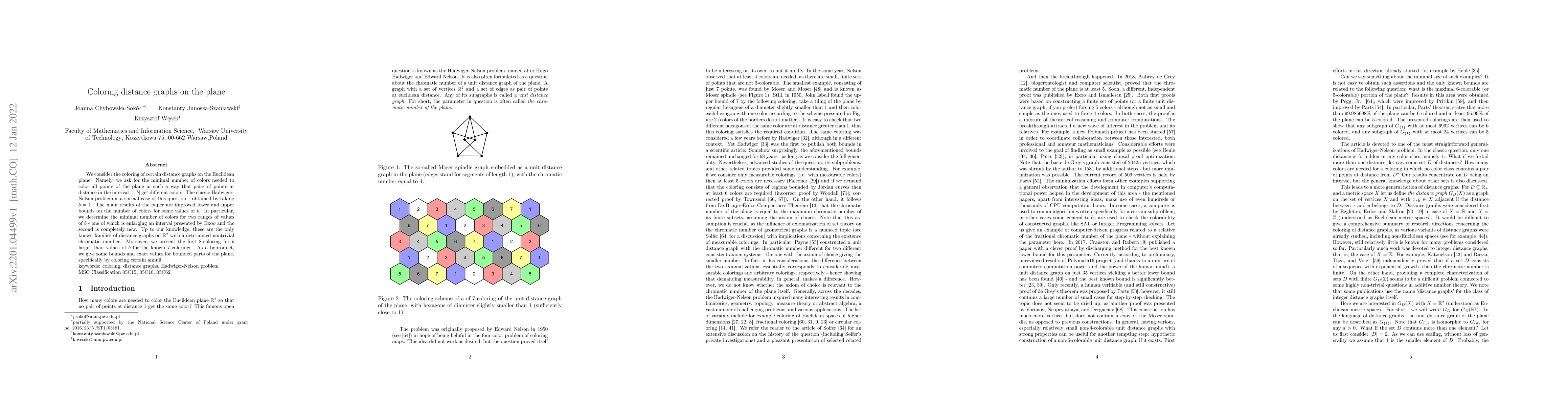 We consider the coloring of certain distance graphs on the Euclidean plane. Namely, we ask for the minimal number of colors needed to color all points of the plane in such a way that pairs of points at distance in the interval $[1,b]$ get different colors. The classic Hadwiger-Nelson problem is a special case of this question -- obtained by taking $b=1$. The main results of the paper are improved lower and upper bounds on the number of colors for some values of $b$. In particular, we determine the minimal number of colors for two ranges of values of $b$ - one of which is enlarging an interval presented by Exoo and the second is completely new. Up to our knowledge, these are the only known families of distance graphs on the plane with a determined nontrivial chromatic number. Moreover, we present the first $8$-coloring for $b$ larger than values of $b$ for the known $7$-colorings. As a byproduct, we give some bounds and exact values for bounded parts of the plane, specifically by coloring certain annuli.