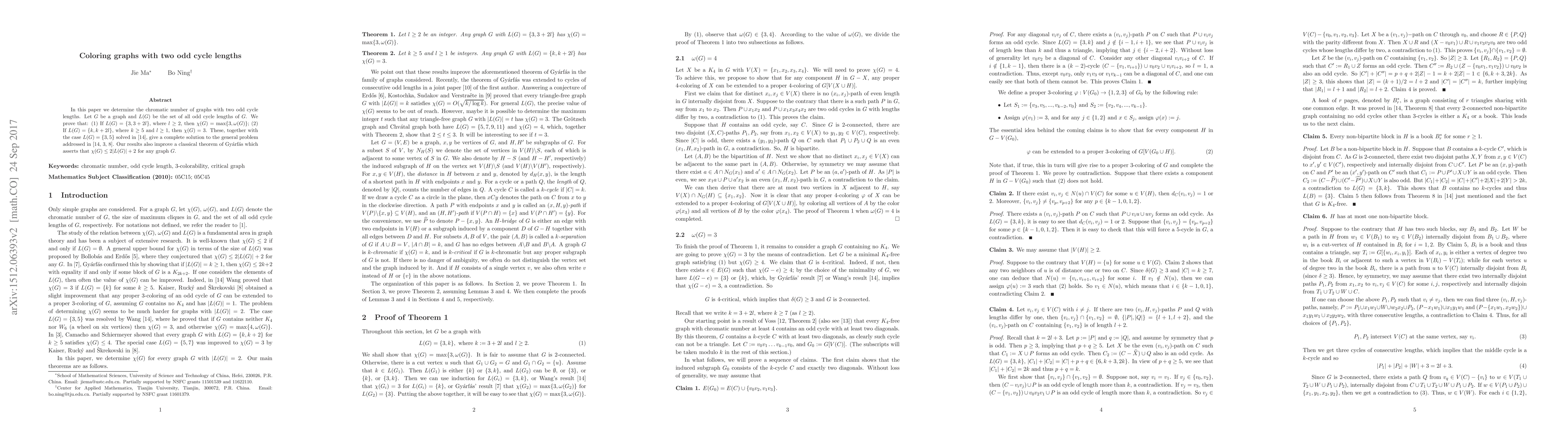 In this paper we determine the chromatic number of graphs with two odd cycle lengths. Let $G$ be a graph and $L(G)$ be the set of all odd cycle lengths of $G$. We prove that: (1) If $L(G)=\{3,3+2l\}$, where $l\geq 2$, then $\chi(G)=\max\{3,\omega(G)\}$; (2) If $L(G)=\{k,k+2l\}$, where $k\geq 5$ and $l\geq 1$, then $\chi(G)=3$. These, together with the case $L(G)=\{3,5\}$ solved in \cite{W}, give a complete solution to the general problem addressed in \cite{W,CS,KRS}. Our results also improve a classical theorem of Gy\'{a}rf\'{a}s which asserts that $\chi(G)\le 2|L(G)|+2$ for any graph $G$.