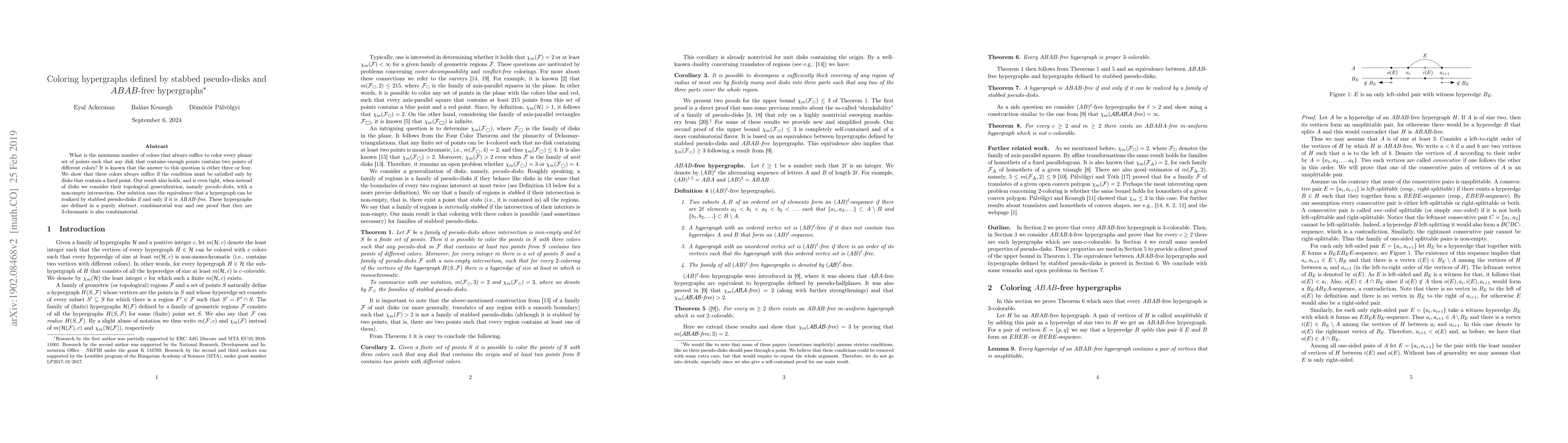 What is the minimum number of colors that always suffice to color every planar set of points such that any disk that contains enough points contains two points of different colors? It is known that the answer to this question is either three or four. We show that three colors always suffice if the condition must be satisfied only by disks that contain a fixed point. Our result also holds, and is even tight, when instead of disks we consider their topological generalization, namely pseudo-disks, with a non-empty intersection. Our solution uses the equivalence that a hypergraph can be realized by stabbed pseudo-disks if and only if it is ABAB-free. These hypergraphs are defined in a purely abstract, combinatorial way and our proof that they are 3-chromatic is also combinatorial.