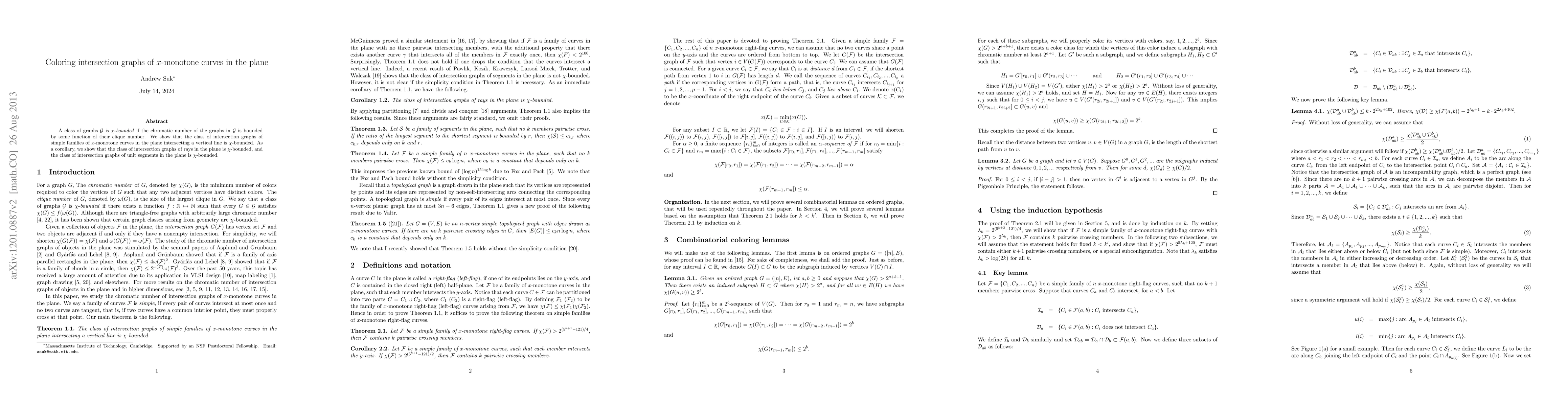 A class of graphs G is chi-bounded if the chromatic number of the graphs in G is bounded by some function of their clique number. We show that the class of intersection graphs of simple x-monotone curves in the plane intersecting a vertical line is chi-bounded. As a corollary we show that the class of intersection graphs of rays in the plane is chi-bounded, and the class of intersection graphs of unit segments in the plane is chi-bounded
