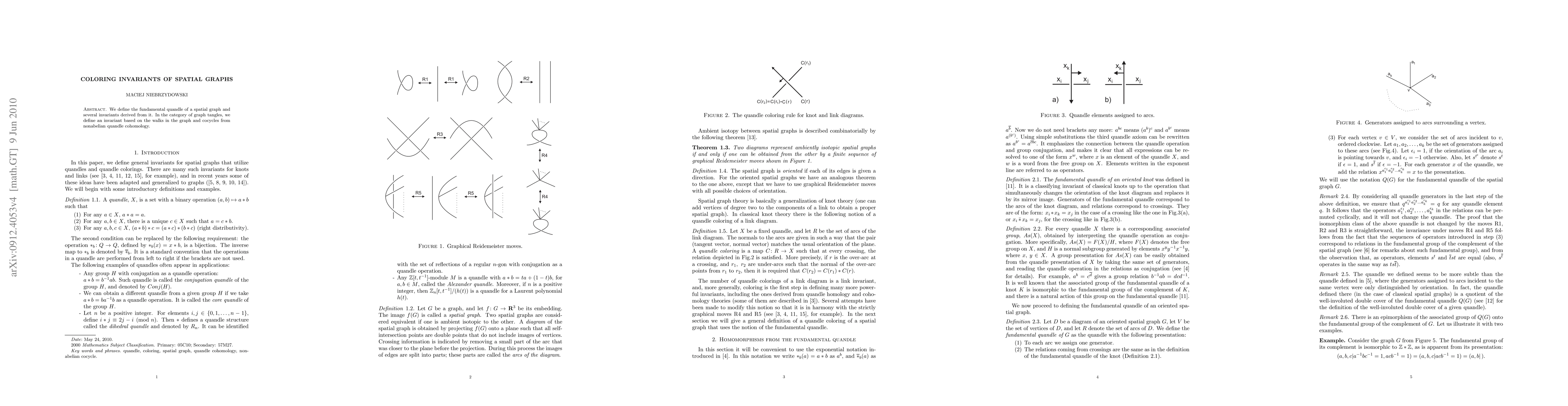 We define the fundamental quandle of a spatial graph and several invariants derived from it. In the category of graph tangles, we define an invariant based on the walks in the graph and cocycles from nonabelian quandle cohomology.