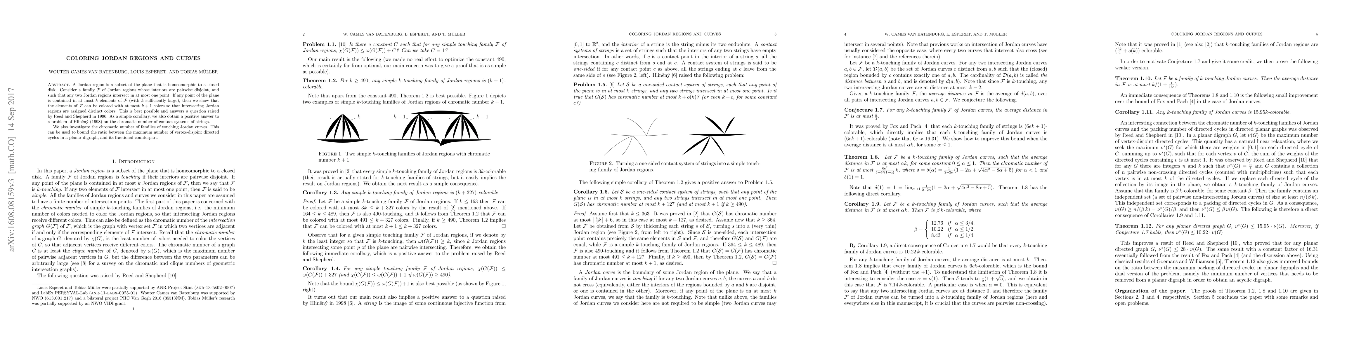 This paper explores the coloring of Jordan regions and curves, proving that a family of such regions can be colored with at most $k+1$ colors when each point in the plane is contained in at most $k$ regions, answering a question from 1996. It also extends the findings to Jordan curves and relates the results to the chromatic number of contact systems and directed cycles in planar digraphs.