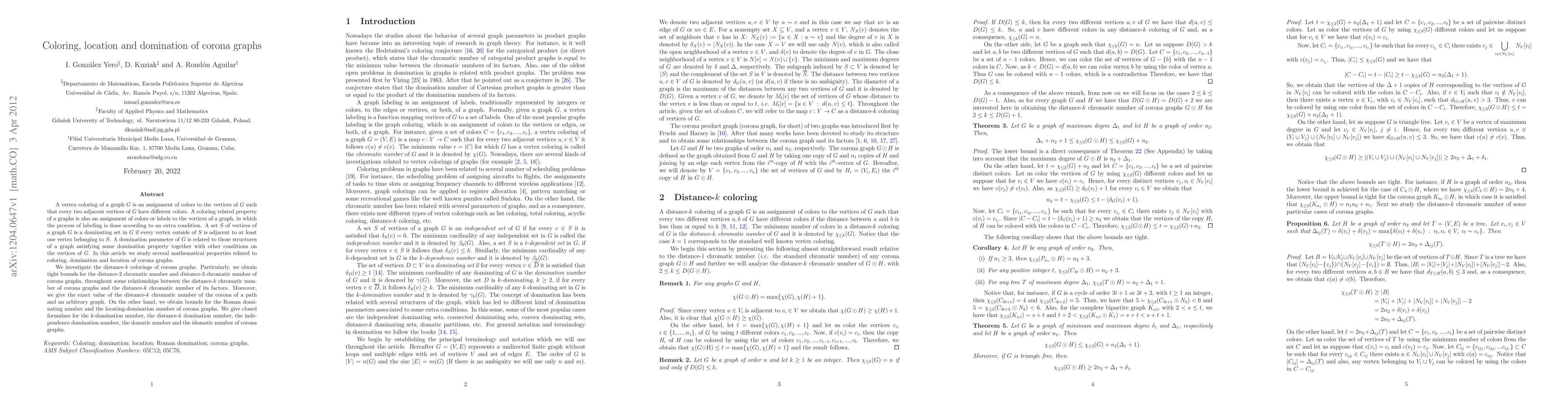 This paper explores various mathematical properties of corona graphs, focusing on vertex coloring, domination, and location aspects. It provides tight bounds for distance-2 and distance-3 chromatic numbers and exact values for the distance-$k$ chromatic number of specific corona graphs. Additionally, it offers closed formulae for several domination parameters of corona graphs.