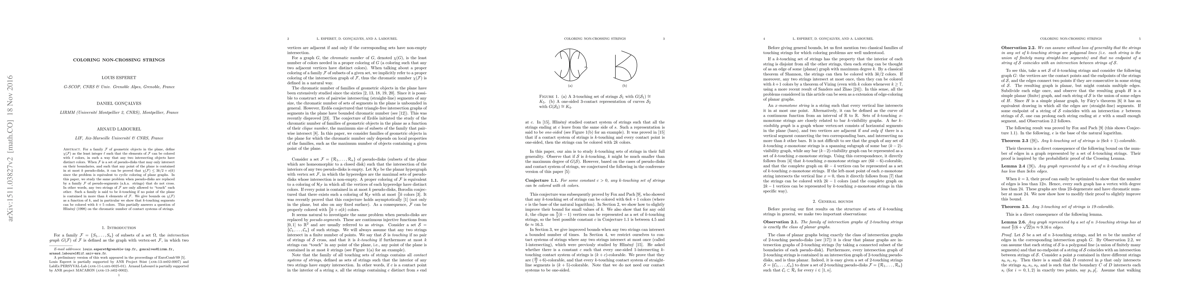 Researchers study coloring non-crossing strings with distinct colors to avoid intersections, finding that k-touching segments can be colored with k+5 colors.