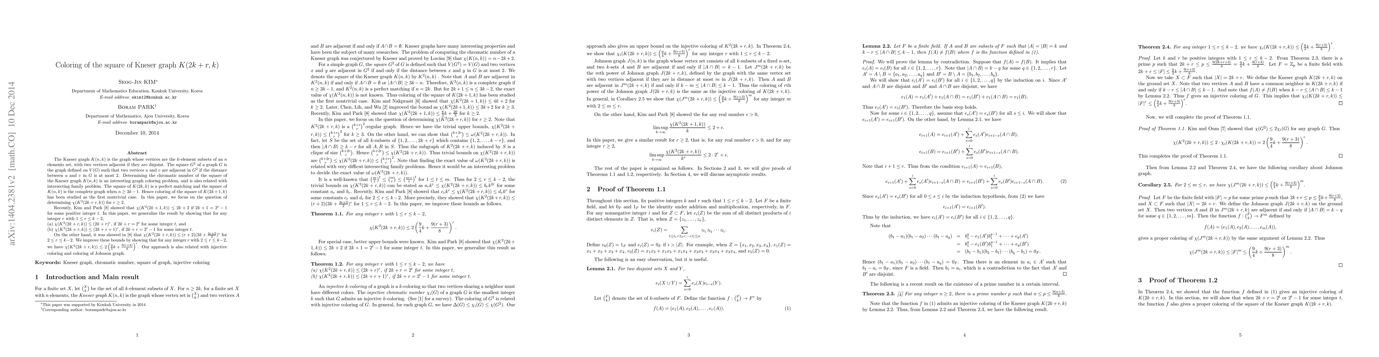 This paper investigates the chromatic number of the square of the Kneser graph $K(2k+r, k)$, providing new bounds for $r \geq 2$. It generalizes previous results by Kim and Park, showing tighter upper bounds for the chromatic number under specific conditions, and connects the results to injective coloring and Johnson graphs.