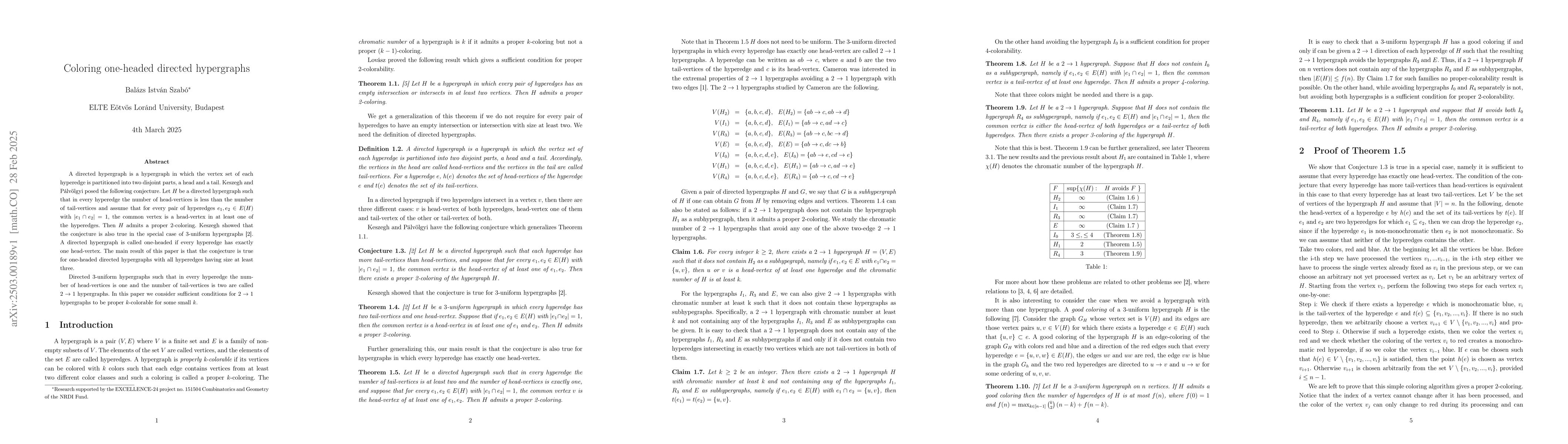 The paper presents a proof for a conjecture on coloring one-headed directed hypergraphs, utilizing induction and case analysis to demonstrate proper coloring with 2 or 3 colors.