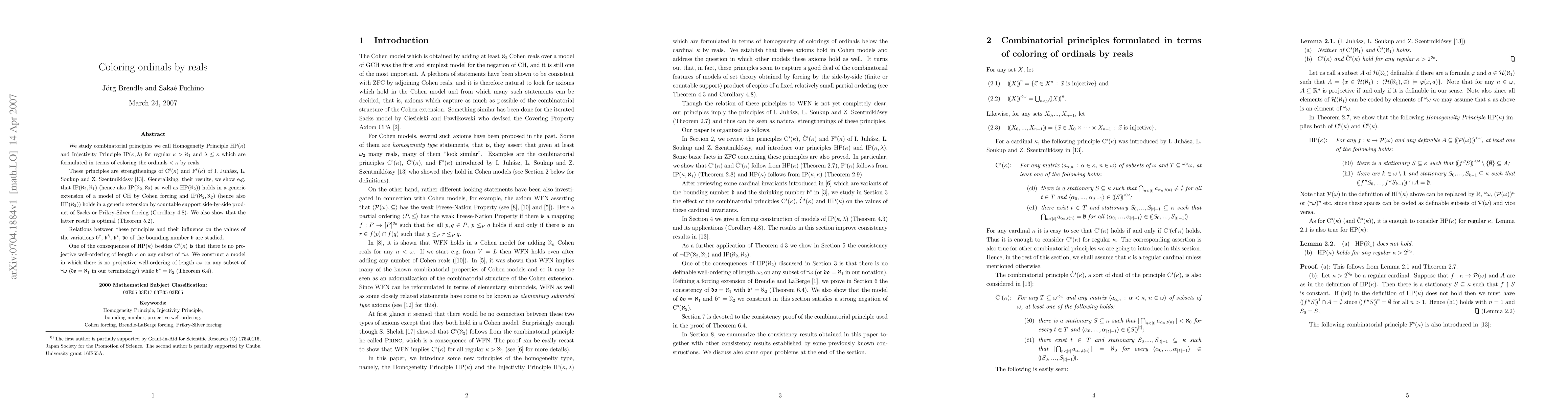 Summary: The paper investigates combinatorial principles, HP(\kappa) and IP(\kappa,\lambda), concerning the coloring of ordinals less than a regular cardinal \kappa>\aleph_1 using real numbers, focusing on their implications and properties.